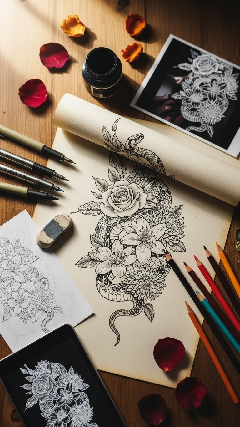 Personalized combos let you mix snakes and flowers your way. Think of adding a special touch to the design. It makes it truly yours. Sketch with free online tools. Budget idea: Incorporate items from your life into the draw. DIY: Add a symbol to your snake sketch. This turns it into a story.