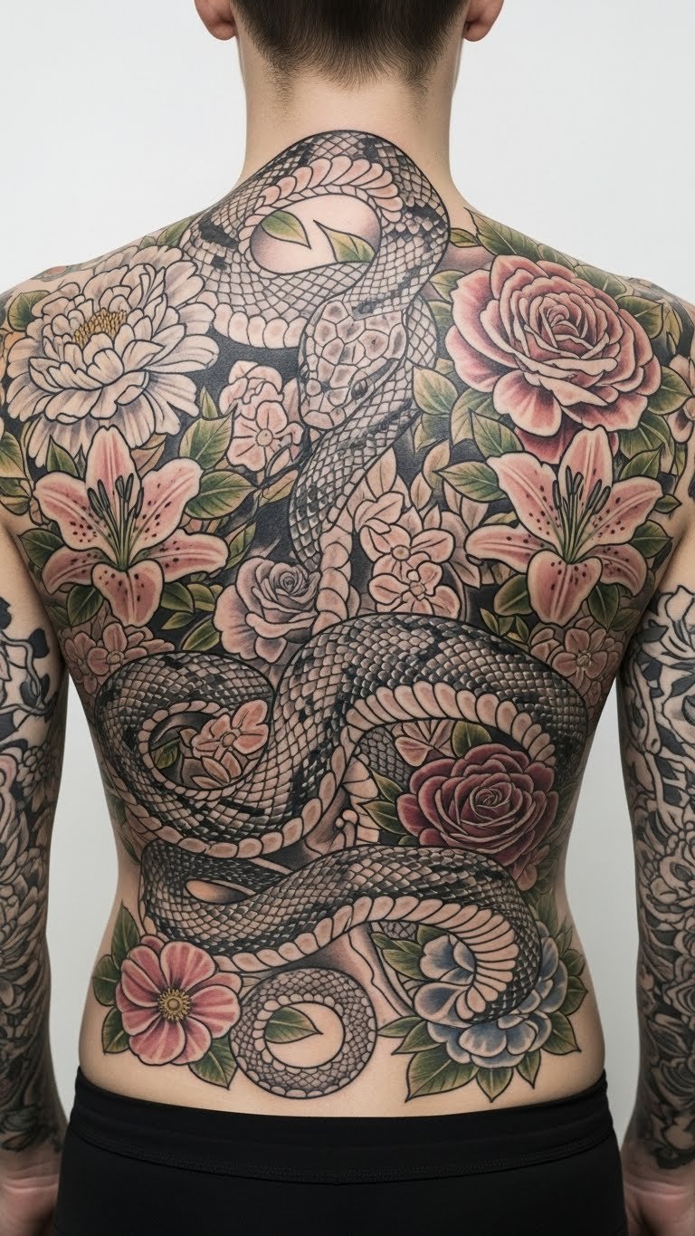 Large tattoos cover more with snakes and flowers. Envision a big design that tells a story. Plan on paper first. Tip: Break it into parts. DIY: Sketch sections at a time. This makes it manageable.