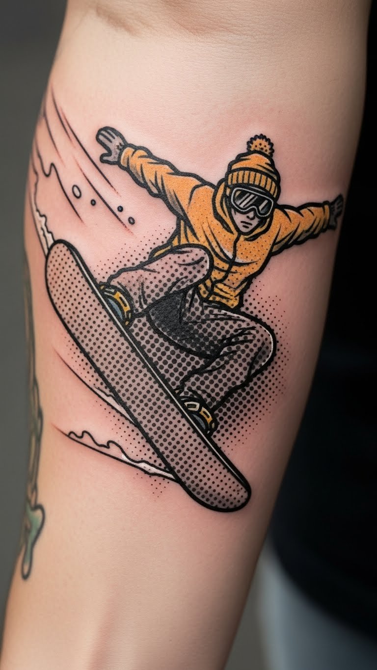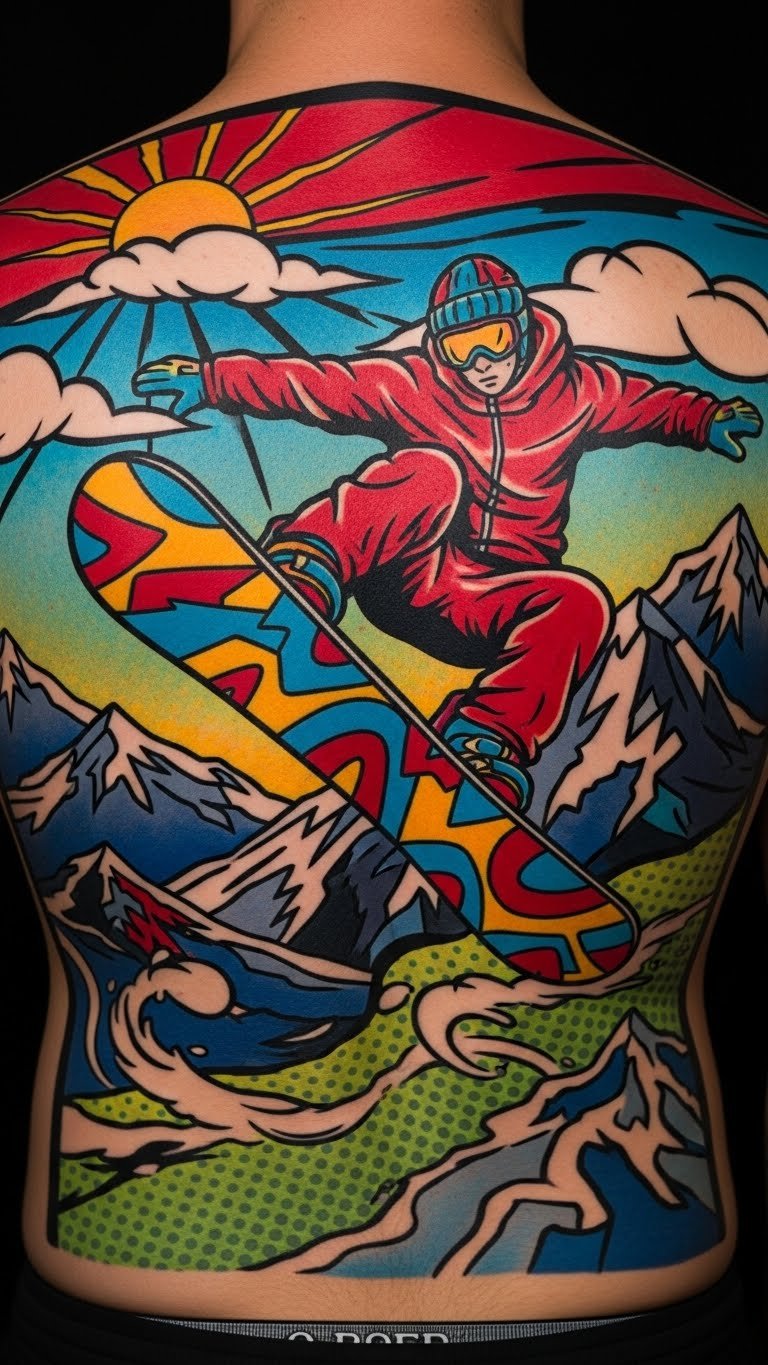 Think vibrant colors and comic vibes for your ink. This pop art snowboard design adds fun to your collection. Sketch ideas with colored pencils at your desk. Position it on your back for a larger canvas. Budget tip: Search for affordable artists at conventions, often $100–$200. Create a DIY version by printing templates from free sites and tracing them. Use basic paints to test colors on paper. It celebrates snowboarding culture with a twist. Keep it small to manage pain and price. Real advice: Pair it with friends for matching sets to share costs.