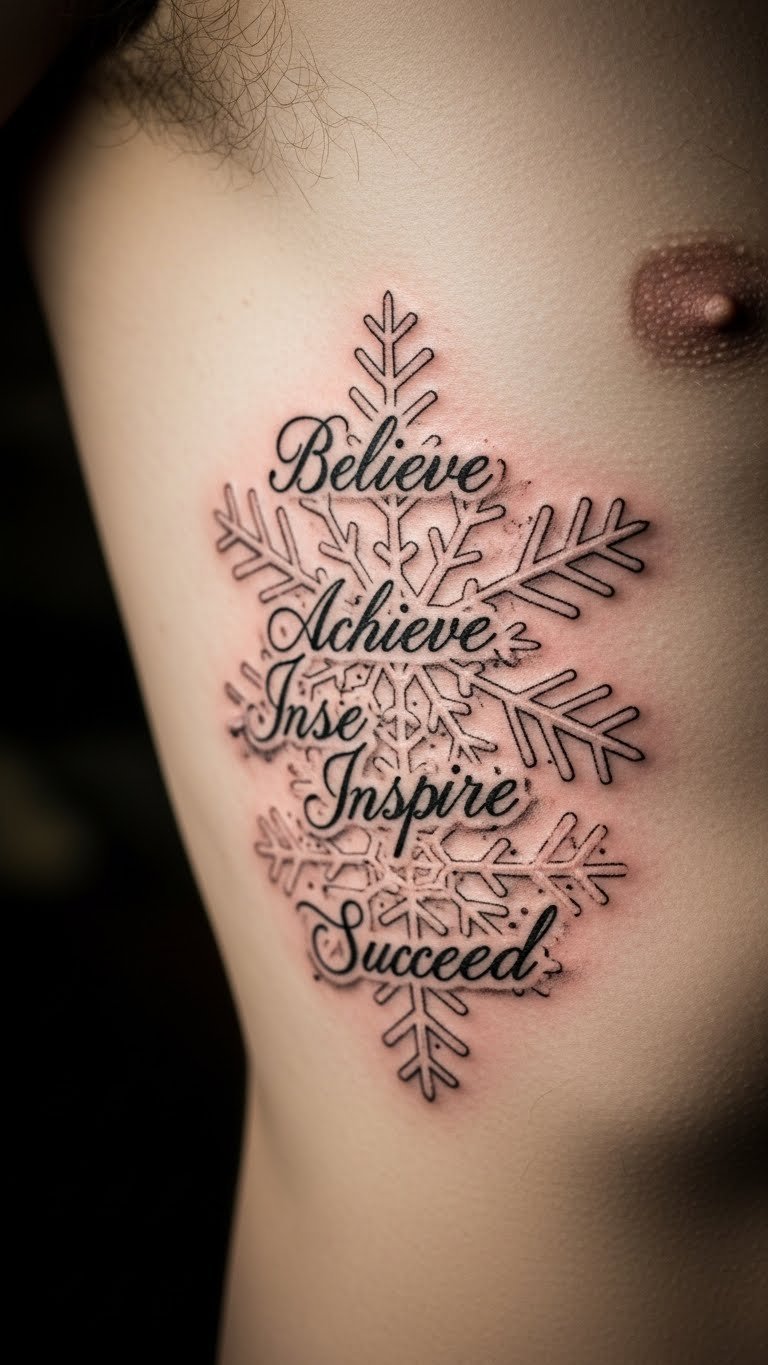 Words that inspire can stay with you forever. This quote from the peaks tattoo blends phrases with snow motifs. Write options in a journal first. Place it on your rib for a hidden gem. Budget tip: Use free quote generators online and bring prints to the artist for savings. Sketch with erasable markers for a DIY trial. Pick lines about freedom for impact. It captures the essence of your rides. Keep fonts simple to lower costs. Real advice: Test with temporary tattoos first.