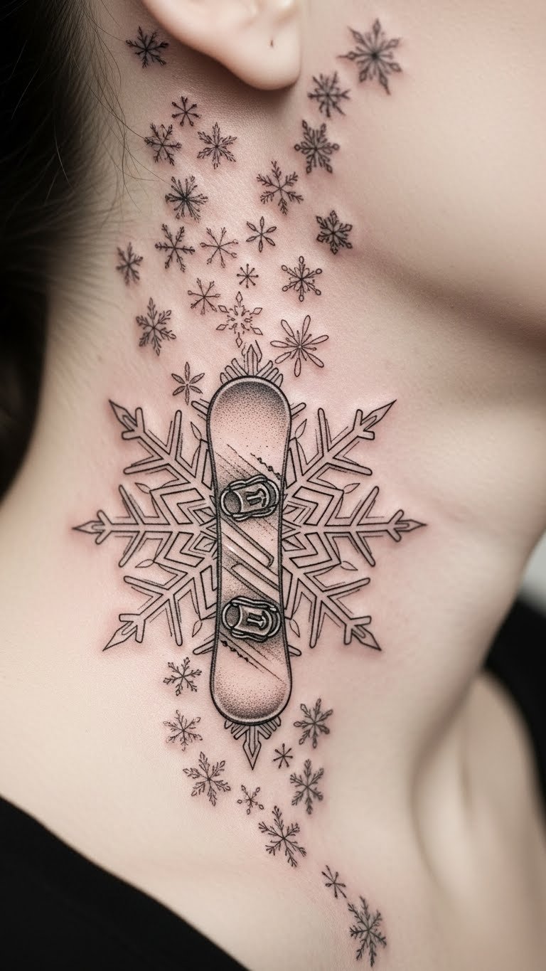 Mix winter magic with your gear. This snowflake and board fusion tattoo layers patterns beautifully. Trace snowflakes on plain paper. Position on your neck for a bold statement. Budget tip: Combine elements in a single session for around $90. Use stencils from craft stores for DIY planning. Make it symmetrical for appeal. It highlights seasonal joy. Go small to reduce discomfort. Real example: Perfect for winter lovers expanding their collection.