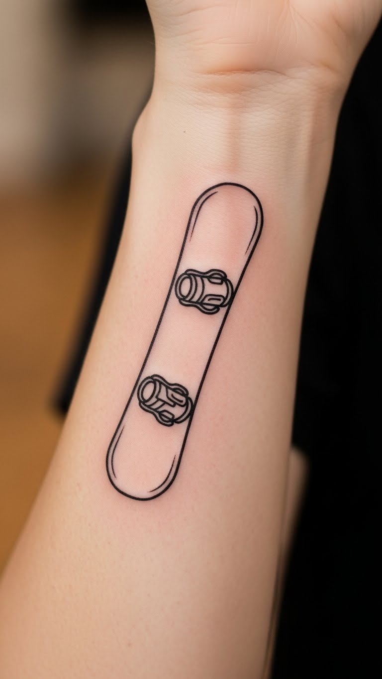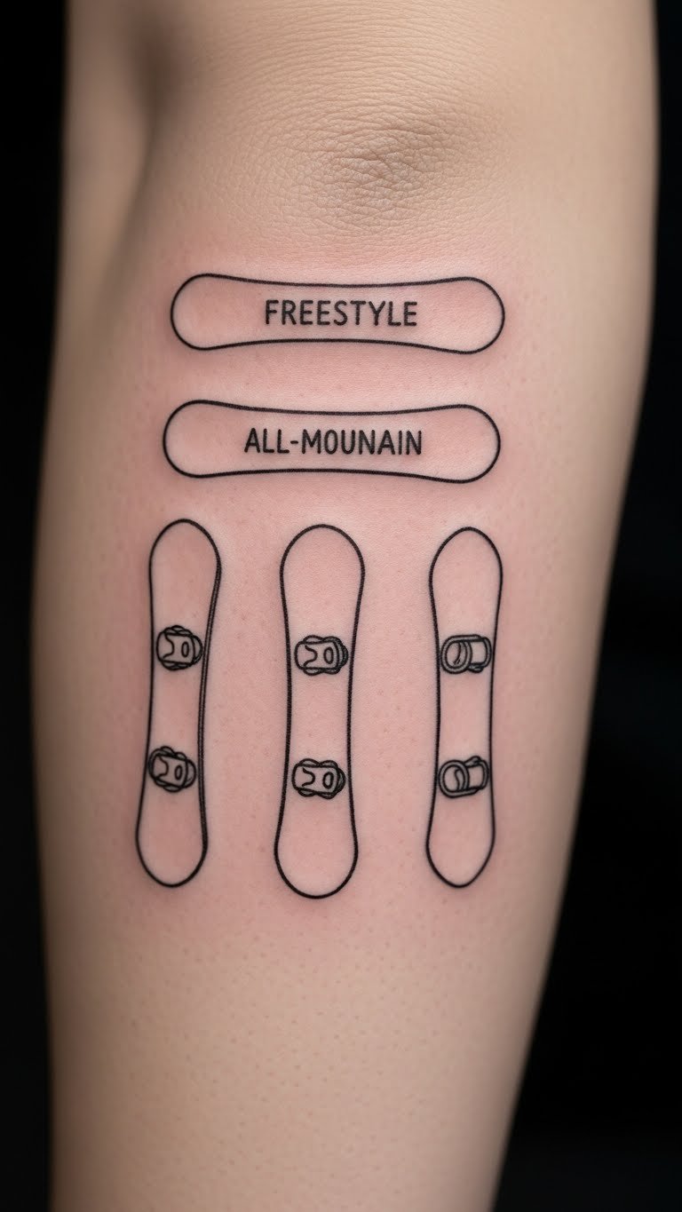 Show off your equipment in ink. This gear-inspired board tattoo focuses on realistic details. Sketch boards from photos at home. Put it on your leg for action vibes. Budget tip: Request simple outlines to keep costs at $70. Create a DIY version with photos and tracing paper. Add boots for completeness. It pays tribute to your setup. Choose black and gray for affordability. Real advice: Easy to cover if needed.