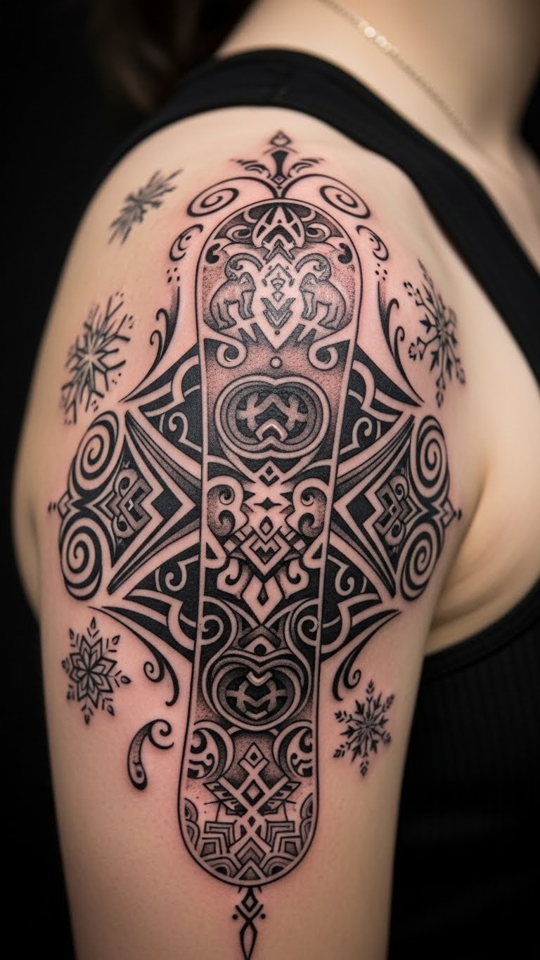 Blend heritage with snow. This culture-infused snow designs tattoo mixes elements. Research your background. Wear on shoulder proudly. Budget tip: Incorporate simple cultural symbols for savings. Sketch fusions at home. Make it meaningful. It tells a story. Opt for basic versions. Real advice: Deepens personal connection.
