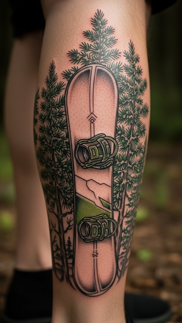 Surround your board with pine trees for a nature link. Stick to two colors for affordability. Draw trees from outdoor photos. This makes it personal. Try tree rub-ons from stores. Put it on your calf. Incorporate trees for depth. The tattoo fits hiking trips. Seal with basic lotions.