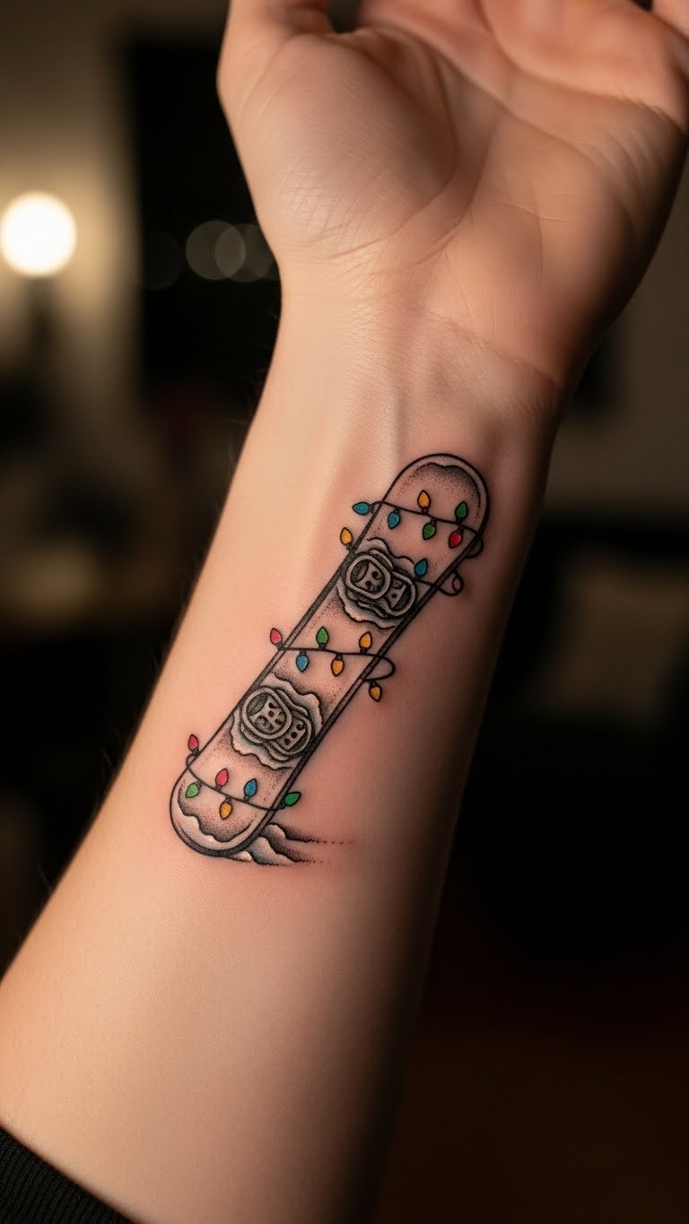 Combine snowflakes with your board for a winter vibe. Choose basic colors to save money. Sketch ideas on a notebook first, using free tools online. This previews the look without paying extra. Get snowflake stencils for home use; they’re cheap and reusable. Position on your arm for visibility. Blend flakes and boards seamlessly. The design holds up in cold weather. Tip: Use phone apps to edit designs before committing. Make it your own with simple tweaks.