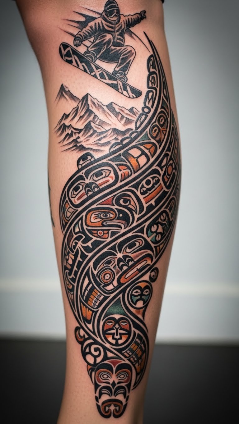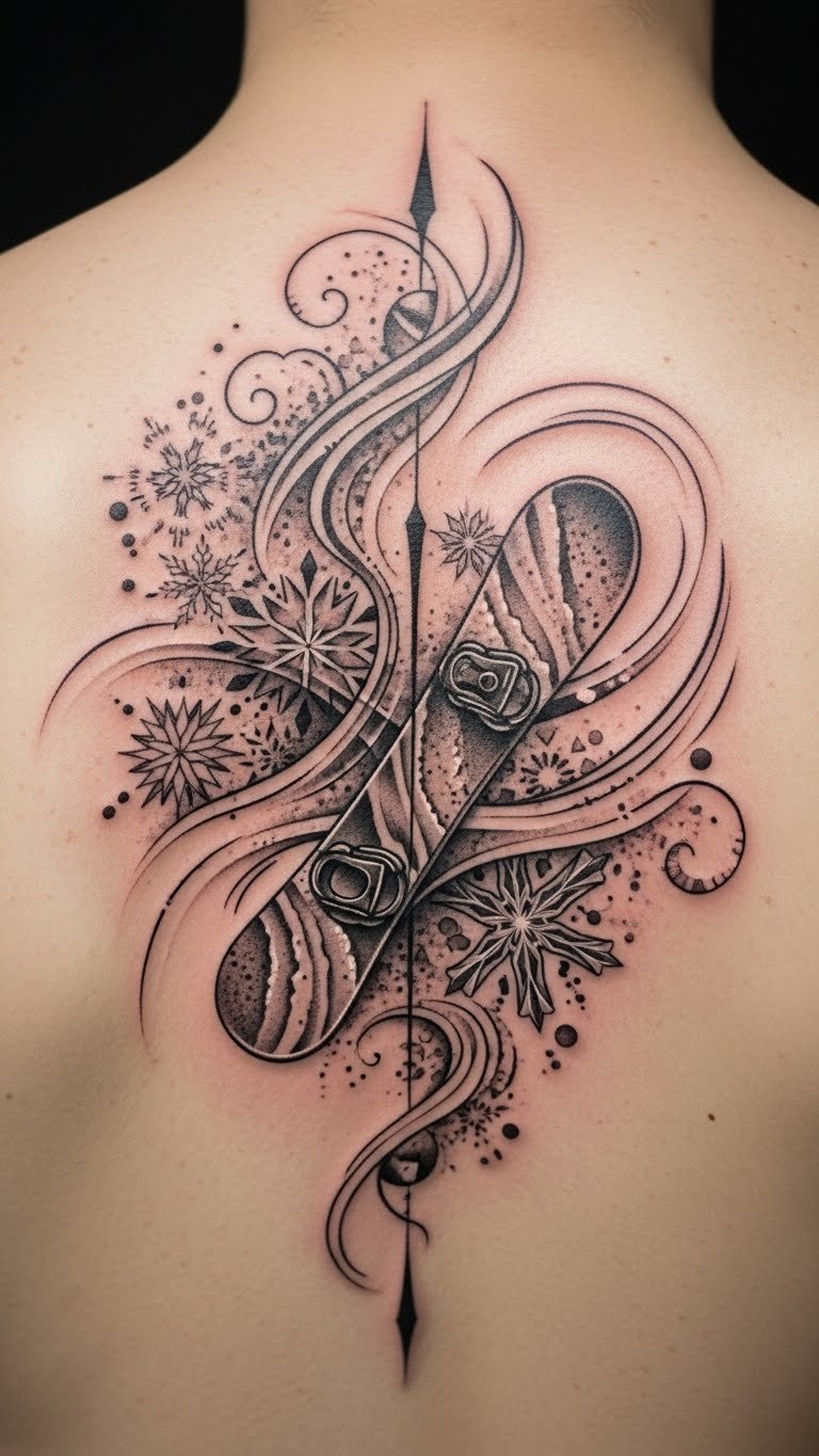 Use motion lines with a snowboard silhouette to show speed on your skin. Stick to black ink for an easy, cheap option. Practice: Draw lines on paper and snap pics to share with your artist. This cuts consultation costs. Try DIY stickers from online templates; they stick for days at low cost. Put it on your calf for movement feel. Incorporate lines for speed. This style stays clear through active days. Bonus: Layer with clear tape over temporaries to extend wear. Keep it fun and functional for your rides.