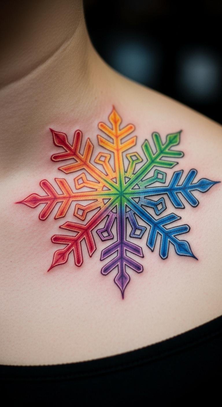 A rainbow colored snowflake tattoo brings vibrancy to your ink. Picture bright stripes on your collarbone. Begin with rainbow crayons for home drawings. It’s colorful fun. Seek rainbow pros with promo rates. DIY with colored tape on your body. Find it cheaply. Wrap it on to preview. Choose collarbones for flair. Bold the hint: use colored tape. This makes testing easy. Mix in your hues. The tattoo pops with energy.