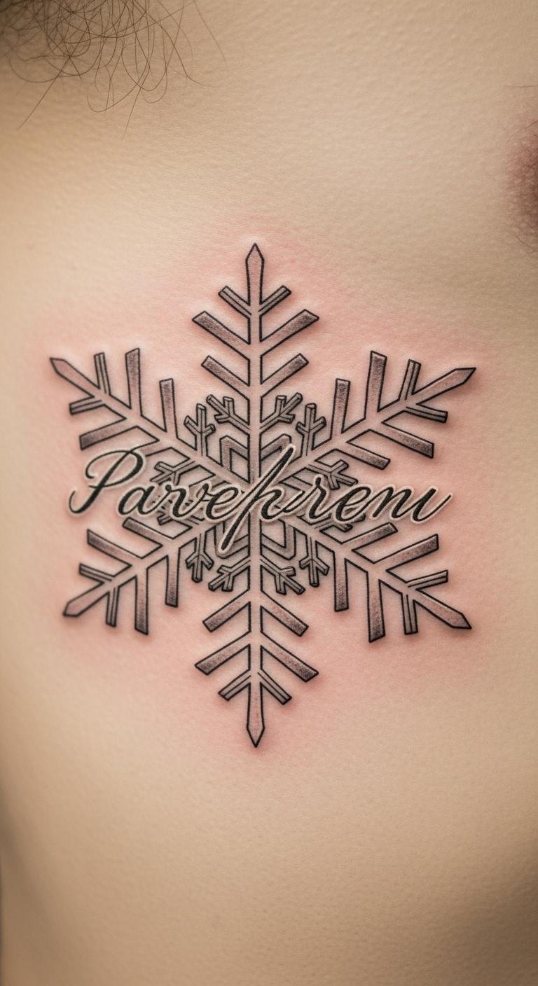 A personalized name snowflake tattoo makes it all about you. Envision your name in the design on your rib. Write names with decorative fonts at home. This personalizes it. Find custom artists with fair pricing. DIY with name templates and pens. Print for free. Trace on skin. Opt for ribs for privacy. Bold the tip: use name templates. This keeps it simple. Weave in your name creatively. The tattoo tells your story.