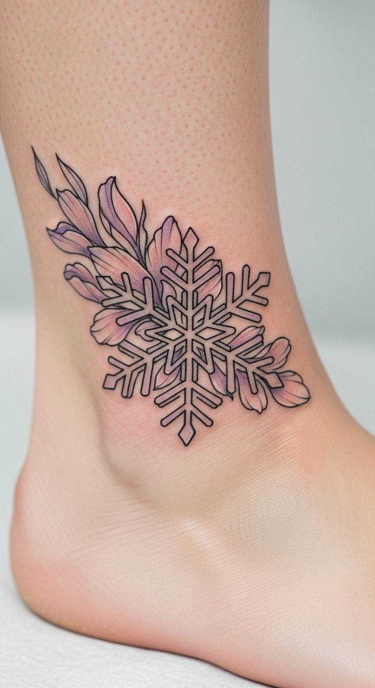 A feminine floral snowflake tattoo mixes flowers with icy shapes for a soft touch. Picture petals around a central flake on your ankle. Start by drawing flowers with colored markers at home. It’s a relaxing way to plan. No special tools required. Look for budget-friendly parlors that do custom work at lower rates. DIY your trial with flower stencils and washable ink. Find them for cheap online. Test on your skin to perfect the blend. Choose hidden areas if needed. Bold the tip: grab stencils for testing. This makes the process simple and fun. Make it yours by incorporating a favorite bloom. The tattoo ends up elegant and personal.