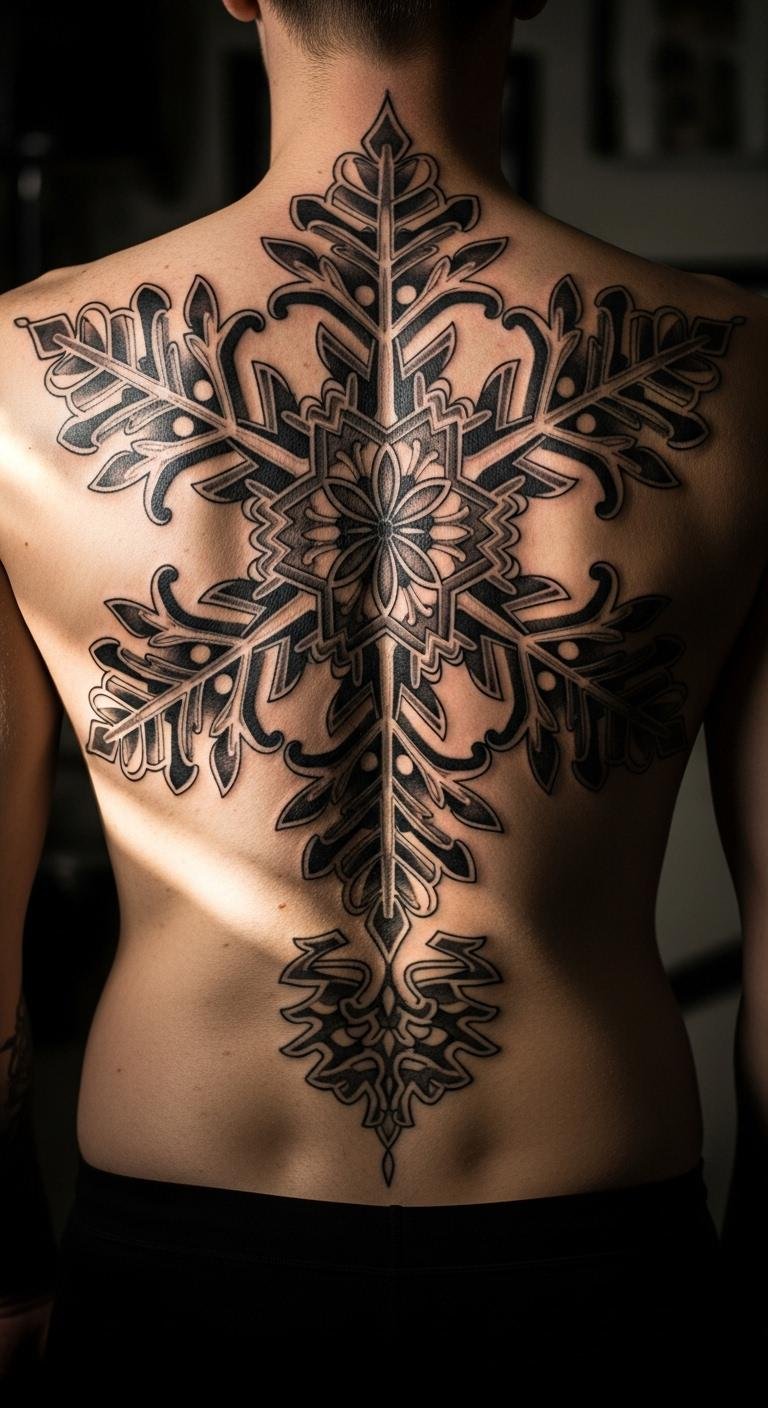 A large back snowflake tattoo makes a grand impression. Envision a big, detailed piece across your back. Start with large paper sketches using crayons. This builds the layout at home. Find artists with package deals to save. DIY a version with large body stickers. Buy them affordably online. Place it on to visualize the scale. Go for the back if you want something private. Bold the tip: try body stickers. This approach keeps things practical. Customize with added motifs. The final design feels epic and personal.