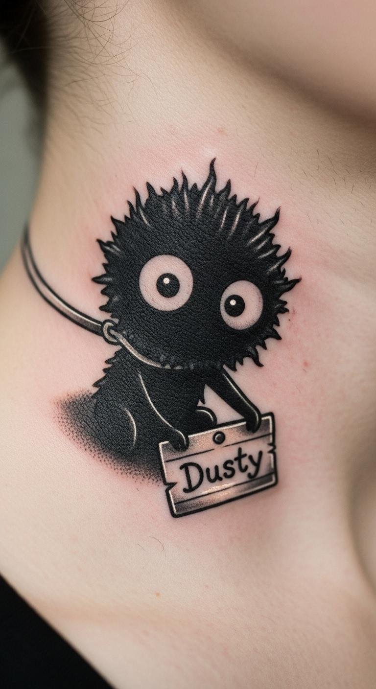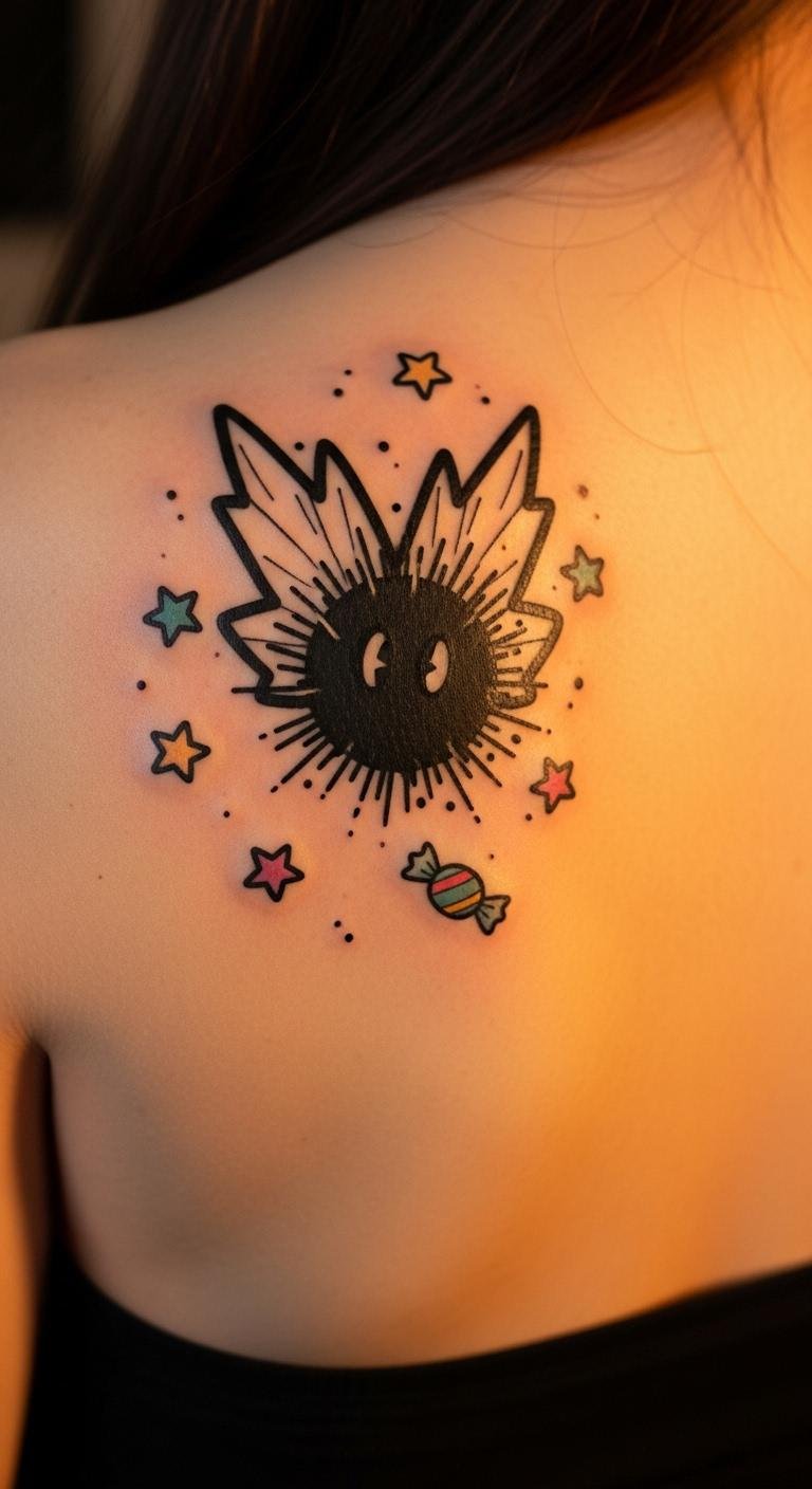 Recall childhood with a soot sprite tattoo. Sketch old memories. Do it in your notebook. Add simple lines. Place it on your back. Bold the key: old memories. Easy: Use past drawings. Keep it straightforward. No big spend.