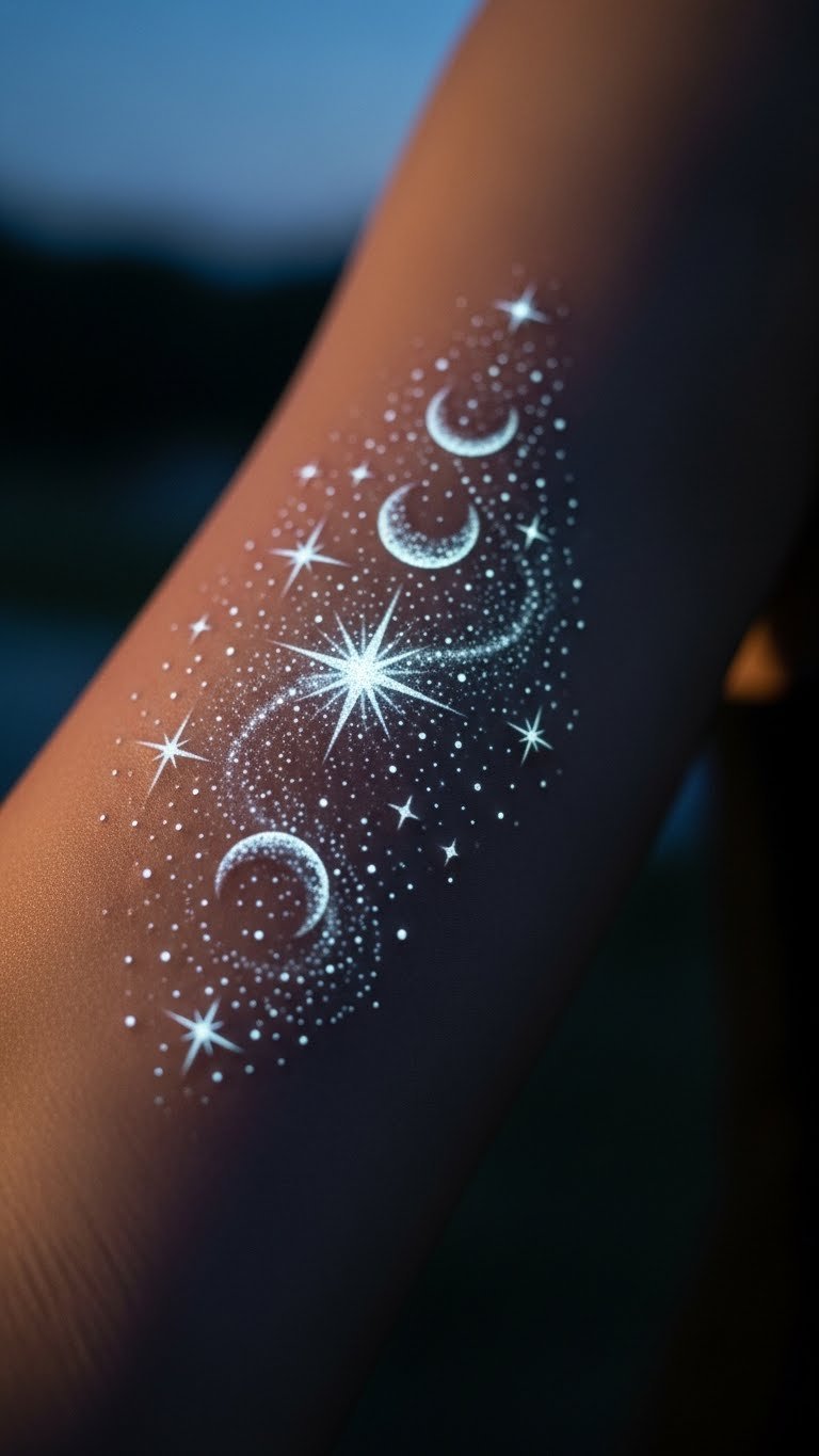 Stars and moons with a sparkle glow create a dreamy feel. Start by picking constellations that mean something to you, like your birth sign. Sketch them on paper first to get the spacing right. For a cheap try, use star-shaped stencils and metallic body paint from dollar stores to mimic the effect. Apply it over your design and wipe off to adjust. Opt for forearm spots for visibility, with costs starting at $80. This makes tattoos feel magical and personal. Pair it with simple jewelry to enhance the look without extra spend.