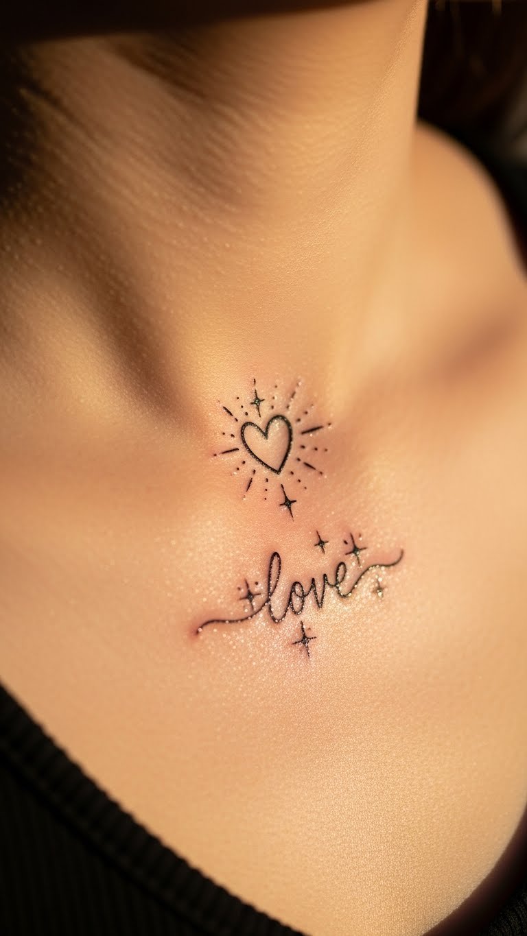 Words like “love” with sparkle promote positivity. Jot down affirmations on paper to choose wisely. Practice with erasable pens on your skin for free. Get affirmation temporary tattoos for $1 and add shimmer powder. Opt for collarbone for a personal touch, priced at $50. This design uplifts your routine. Wear it with confidence-building clothes.