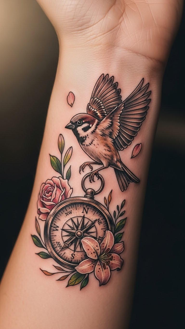 Pair your sparrow with extras like compasses or flowers. It boosts the freedom theme. Affordable combos start at $100. Sketch the layout on paper quickly. Use string and beads for a DIY mock-up at home. Place it on your wrist for guidance. Blend elements that speak to you. This design guides your path.