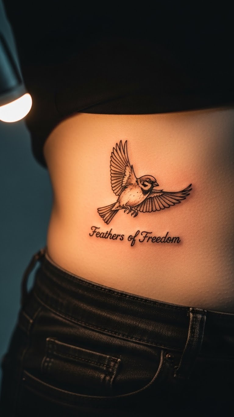 Add a quote to your sparrow for extra inspiration. It pairs words with hope. Budget quotes start at $80. Write options on paper. Practice with temporary tattoos from the store. Place on your rib for privacy. Pick uplifting lines. This design motivates you.