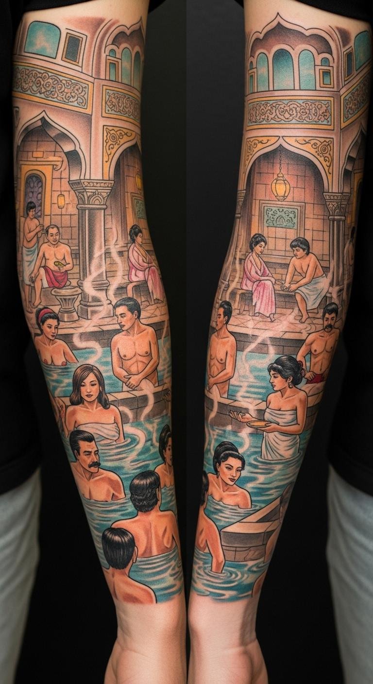 The bathhouse symbolizes work and growth. Turn it into a full sleeve for a story. Plan with free drawing tools online. Practice on fabric scraps at home. Add your twists, like hidden symbols. Opt for line work to save money. Bold key: life scene ink. DIY tip: Use washable markers for a mock-up. It’s under $5 and helps with placement. Build it step by step for meaning. This design tells your narrative affordably.