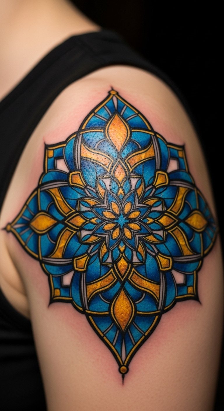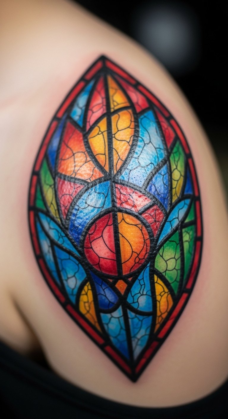 Hybrid stained glass tattoos mix realism on your shoulder. Sketch realistic parts on paper. Combine styles easily. This design fuses looks. Try apps for blends. Put it on key spots. Add real-life touches. Save by mixing simple. Look at photos for ideas. This tattoo bridges worlds. Draw hybrids first.