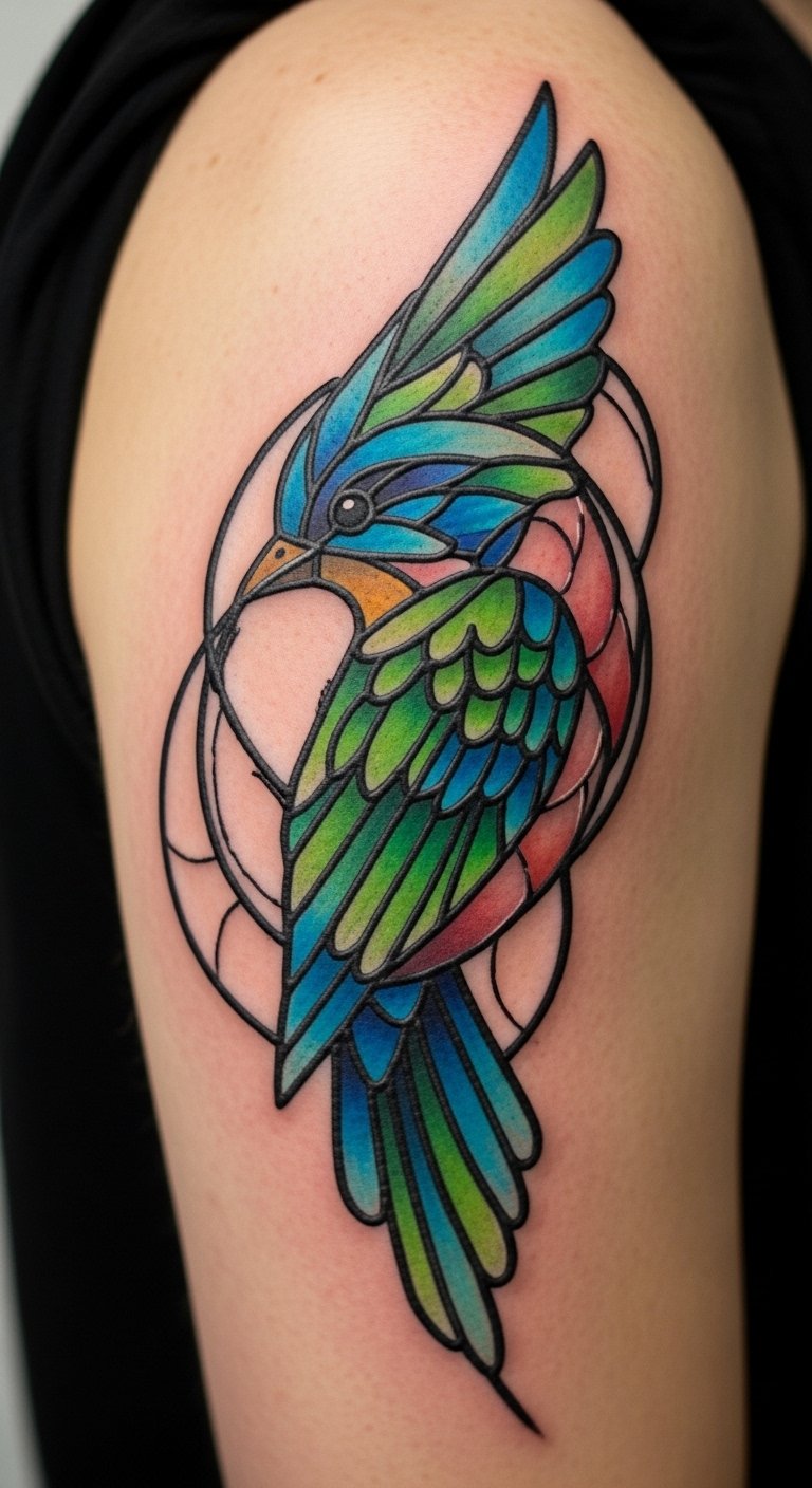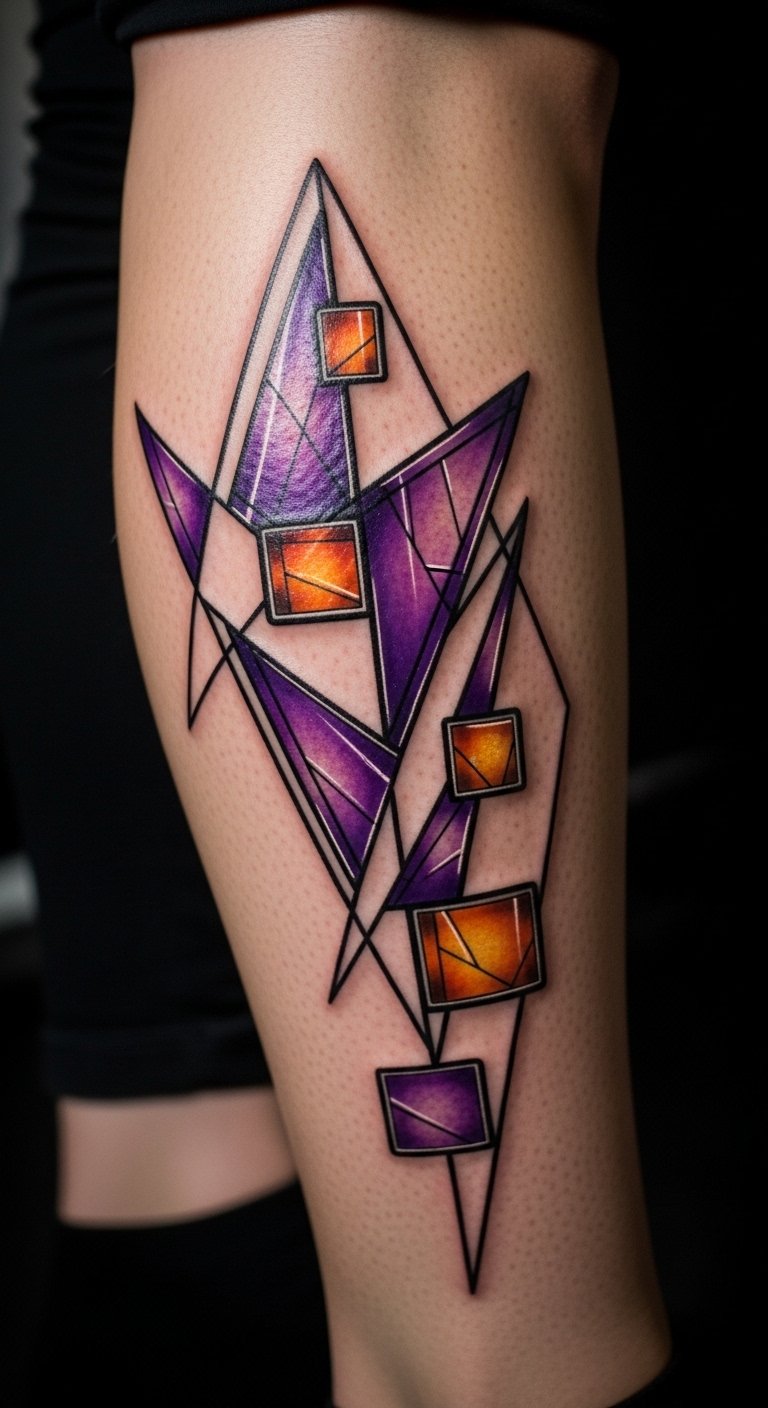 Geometric stained glass tattoos create cool shapes on your leg, blending modern art with skin. Grab paper and a ruler from home to sketch triangles and squares for free. Play with basic forms to see what fits. This design uses straight lines for a sharp effect. Use phone apps to arrange colors quickly. Put it on areas like your ankle for a subtle statement. Add your twist, like adding a favorite number. Stay within budget by keeping it simple. Look at everyday objects for shape ideas. This tattoo makes your body feel like abstract art. Practice drawing to get ready for the artist.