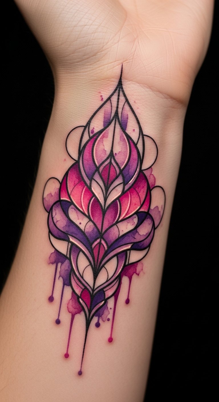 Watercolor stained glass tattoos give a soft glow to your wrist, like painted glass. Blend colors on paper using water and markers at home. This keeps things easy and cheap. Focus on gentle transitions for flow. Try phone filters to preview looks. Place it where it catches light, like your hand. Add your flair with favorite shades. Save by using what you own. Gather ideas from art books. This tattoo feels like a gentle story. Draw simple blends to start.