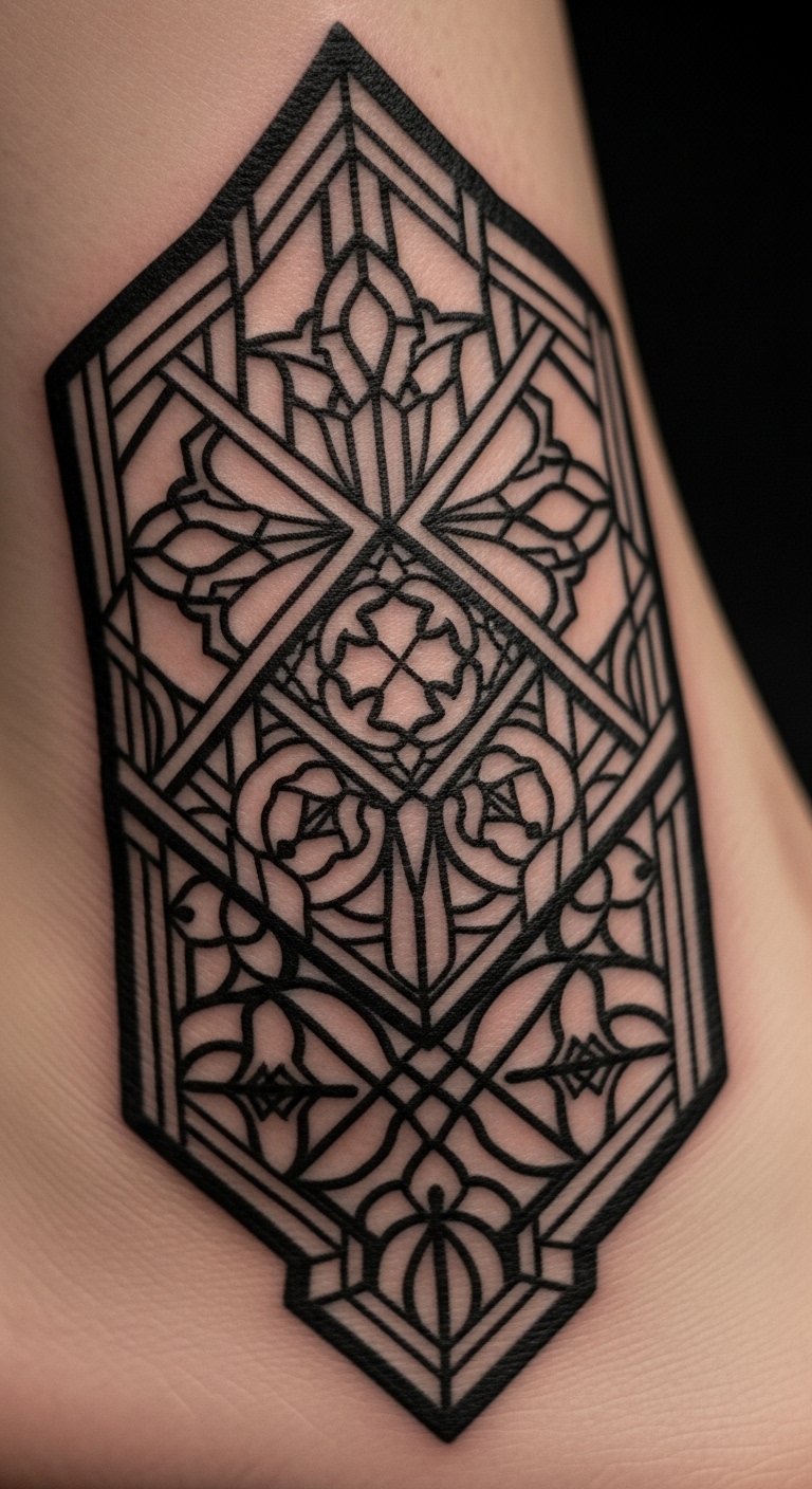 Blackwork stained glass tattoos offer clean lines on your ankle, without colors. Trace patterns on paper with a pen you have. This design emphasizes edges. Use free templates online for practice. Keep it on small areas for subtlety. Add simple twists, like extra lines. Budget with basic tools. Find ideas in line drawings. This tattoo keeps things straightforward. Sketch quickly to prepare.