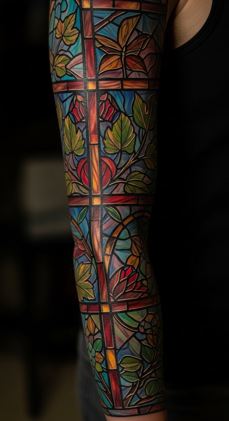 A full sleeve stained glass tattoo flows with nature themes along your arm. Plan sections on large paper at home. Break it into parts for ease. This design uses colors for a big impact. Draw with free software on your device. Place it for full expression. Include elements that tell your story. Save by phasing the work. Look at outdoor scenes for ideas. This tattoo becomes a personal epic. Start with rough outlines.