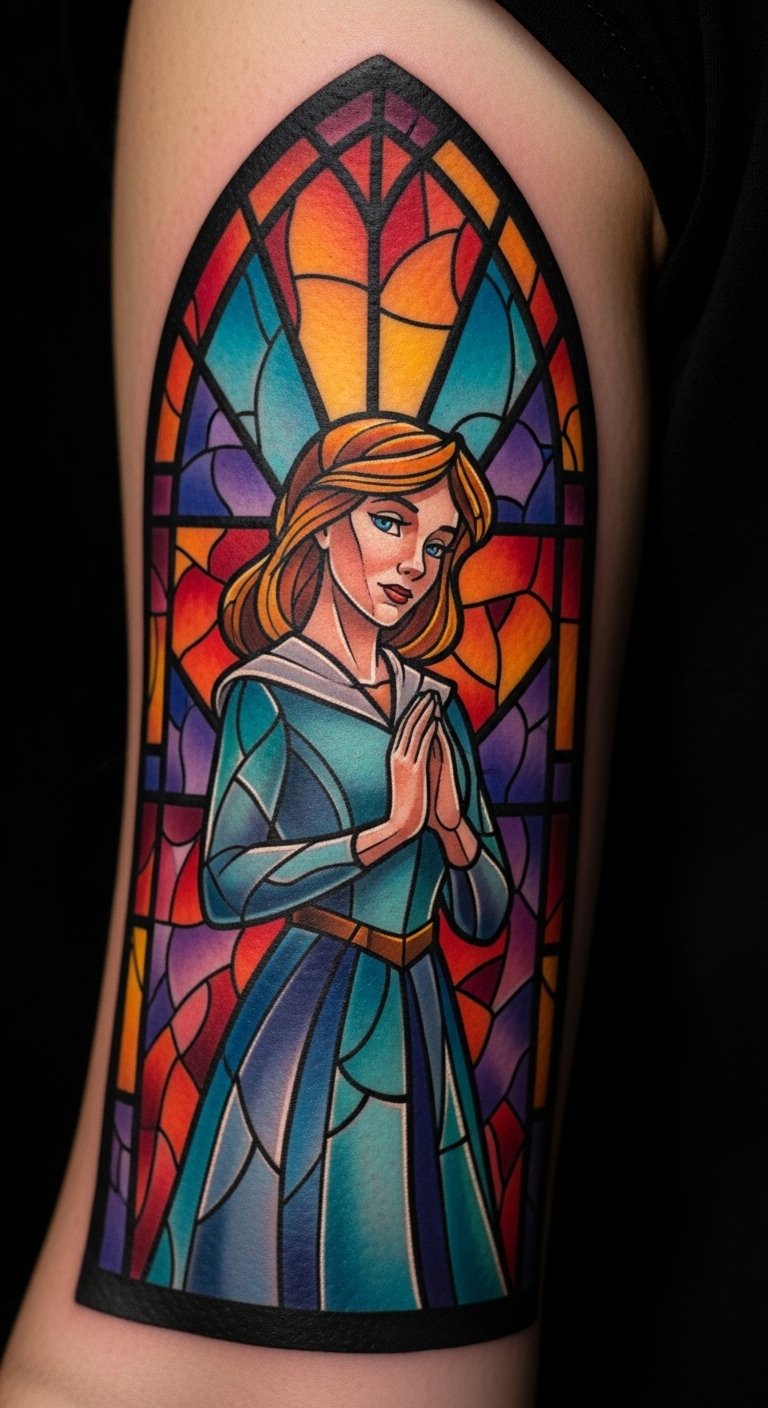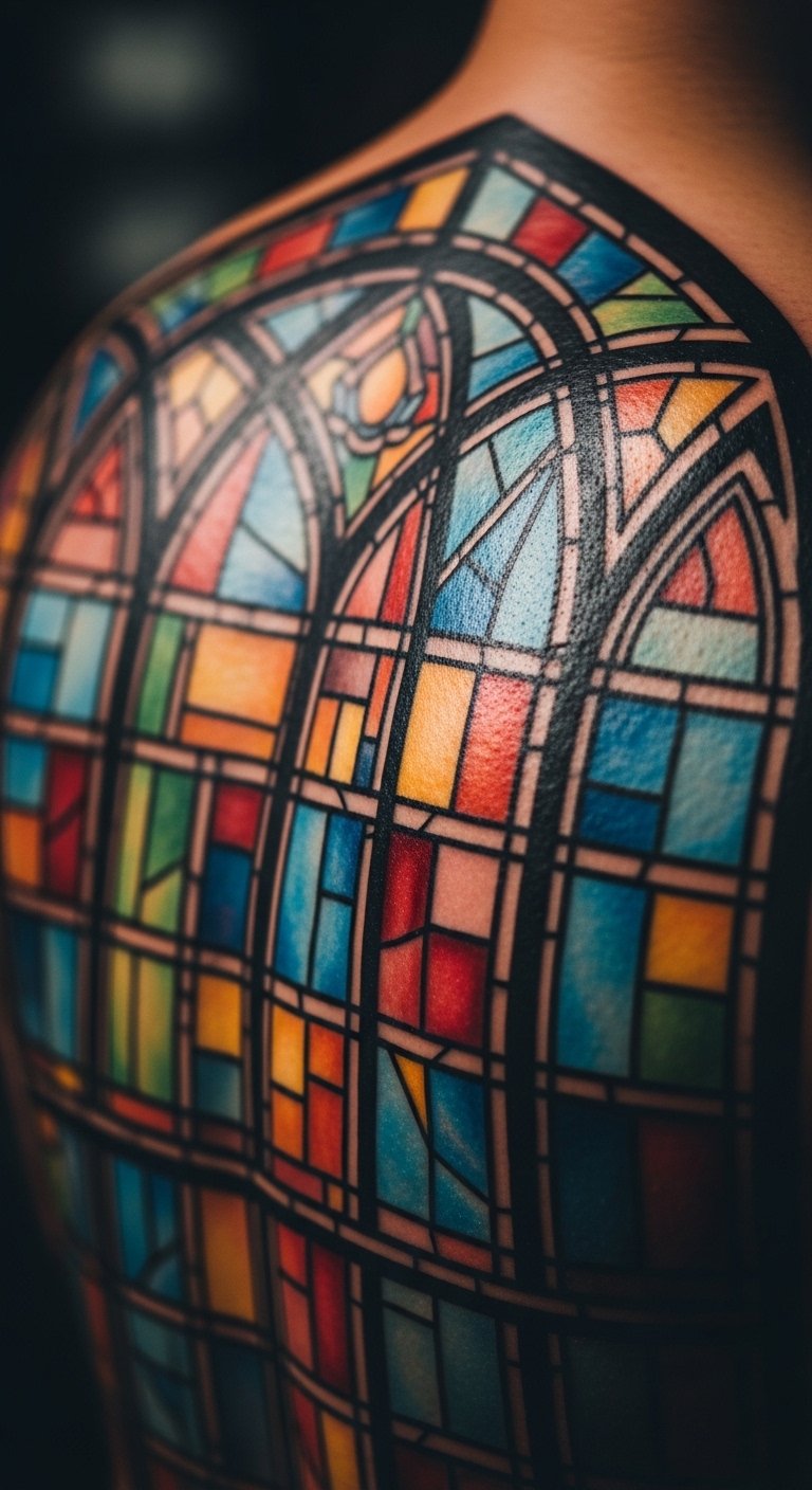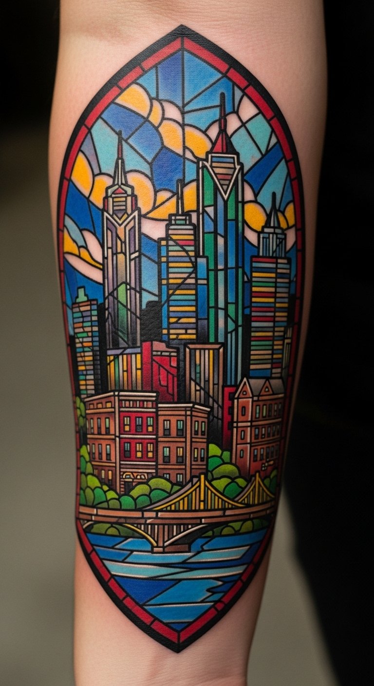 Modern stained glass tattoos show cityscapes on your arm. Map buildings on paper. Keep it urban. This design captures scenes. Use apps for views. Place it dynamically. Include city elements. Budget with sketches. Find ideas in cities. This tattoo reflects life. Draw views first.