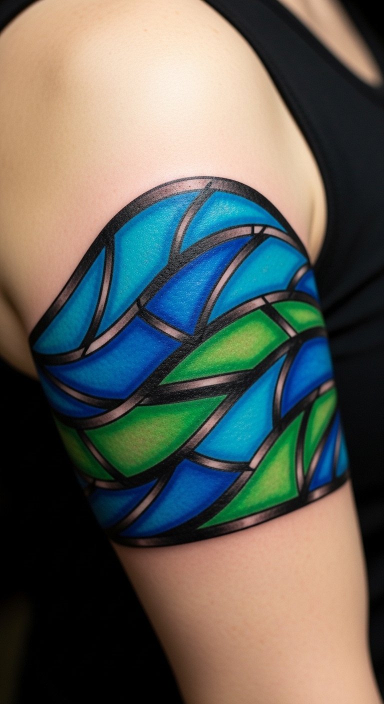 An armband stained glass tattoo adds waves around your arm. Sketch curves on paper easily. Keep it flowing and simple. This design uses colors for movement. Try free drawing tools. Wear it as a band. Include wave variations. Save with quick plans. Find ideas in water photos. This tattoo feels dynamic. Practice curves at home.