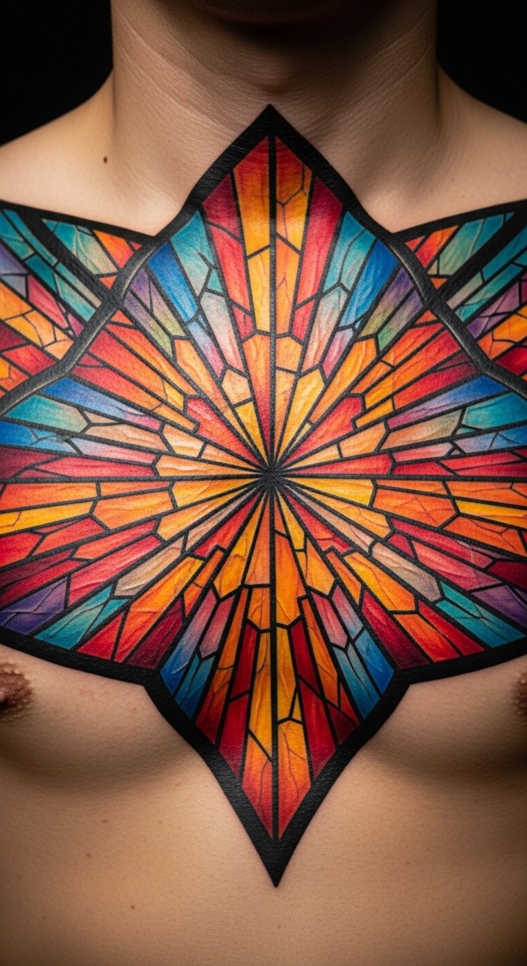 Chest stained glass tattoos explode with colors on your front. Draw bursts on paper with crayons. Focus on bright spots. This style pops with energy. Use phone edits for fun. Place it center stage. Add your color choices. Budget by keeping it vibrant. Look at sunsets for ideas. This tattoo ignites passion. Start with color tests.