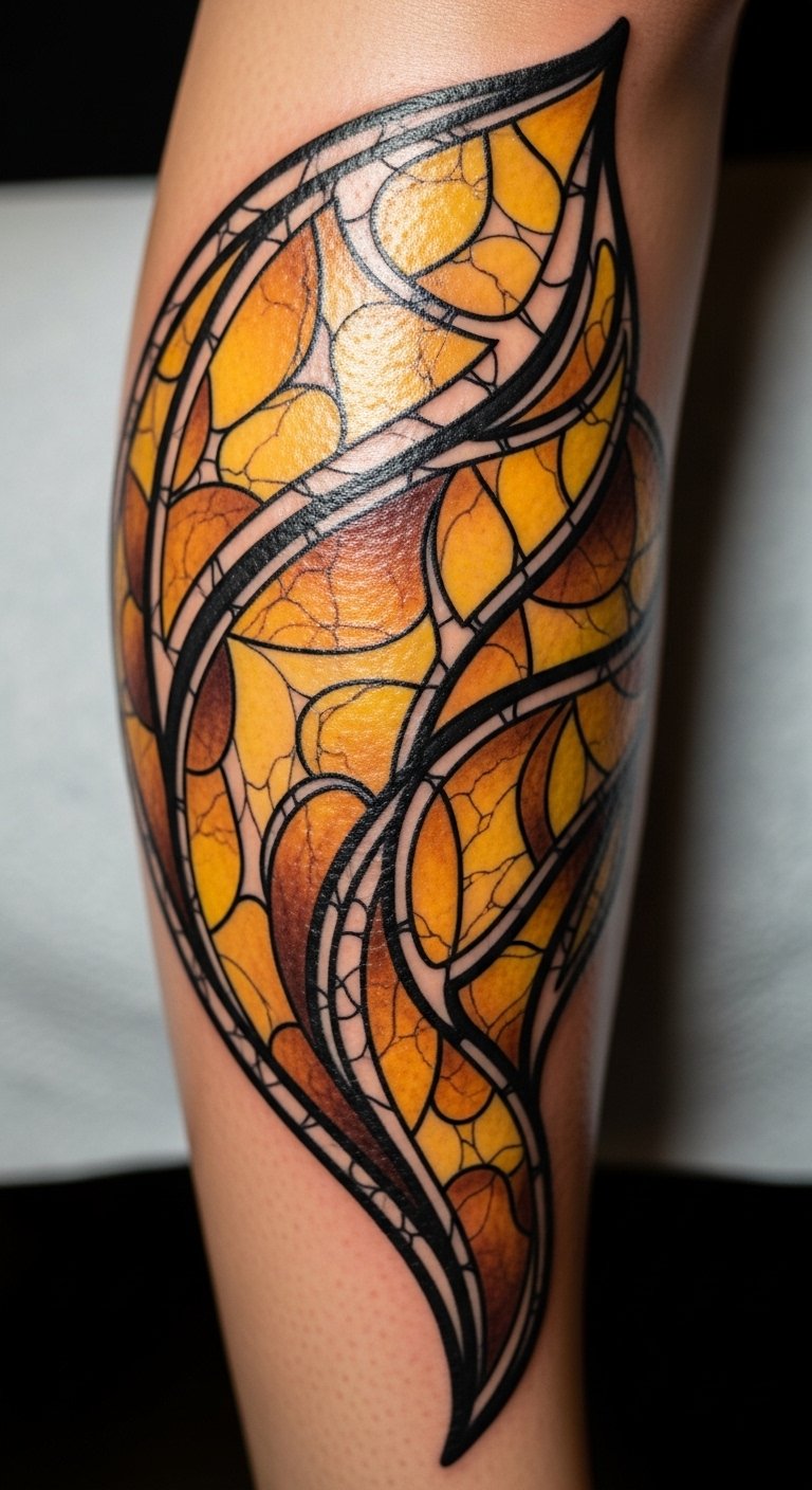 Leg stained glass tattoos follow curves down your limb. Trace paths on paper simply. Make it follow your shape. This design uses lines for direction. Experiment with apps. Put it on your calf. Include path twists. Save with basic sketches. Gather ideas from walks. This tattoo guides your way. Draw paths first.