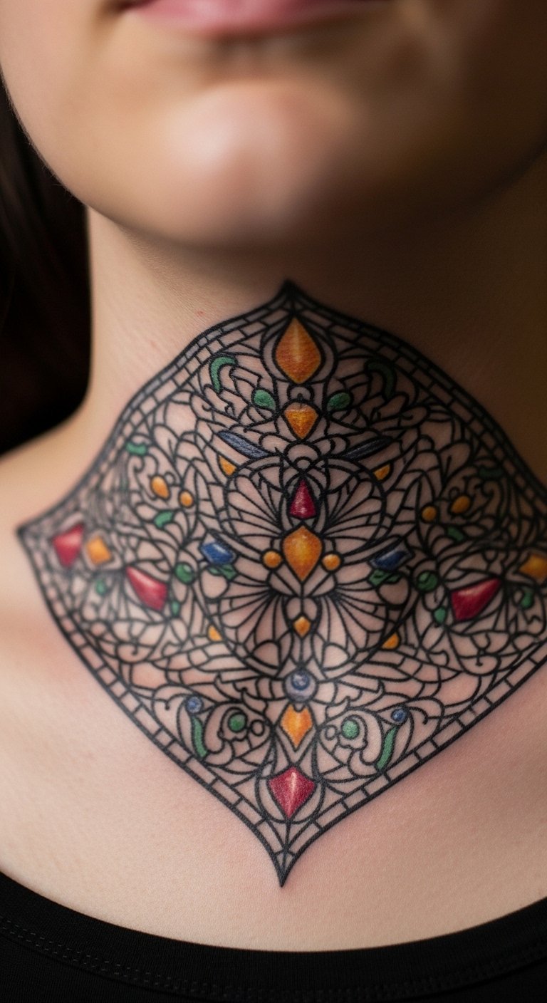 Neck stained glass tattoos add delicate patterns to your throat. Draw light designs on paper. Focus on finesse. This style whispers elegance. Try quick phone sketches. Keep it on your neck. Include soft elements. Save by simplifying. Look at fabrics for ideas. This tattoo enhances grace. Practice gentle lines.