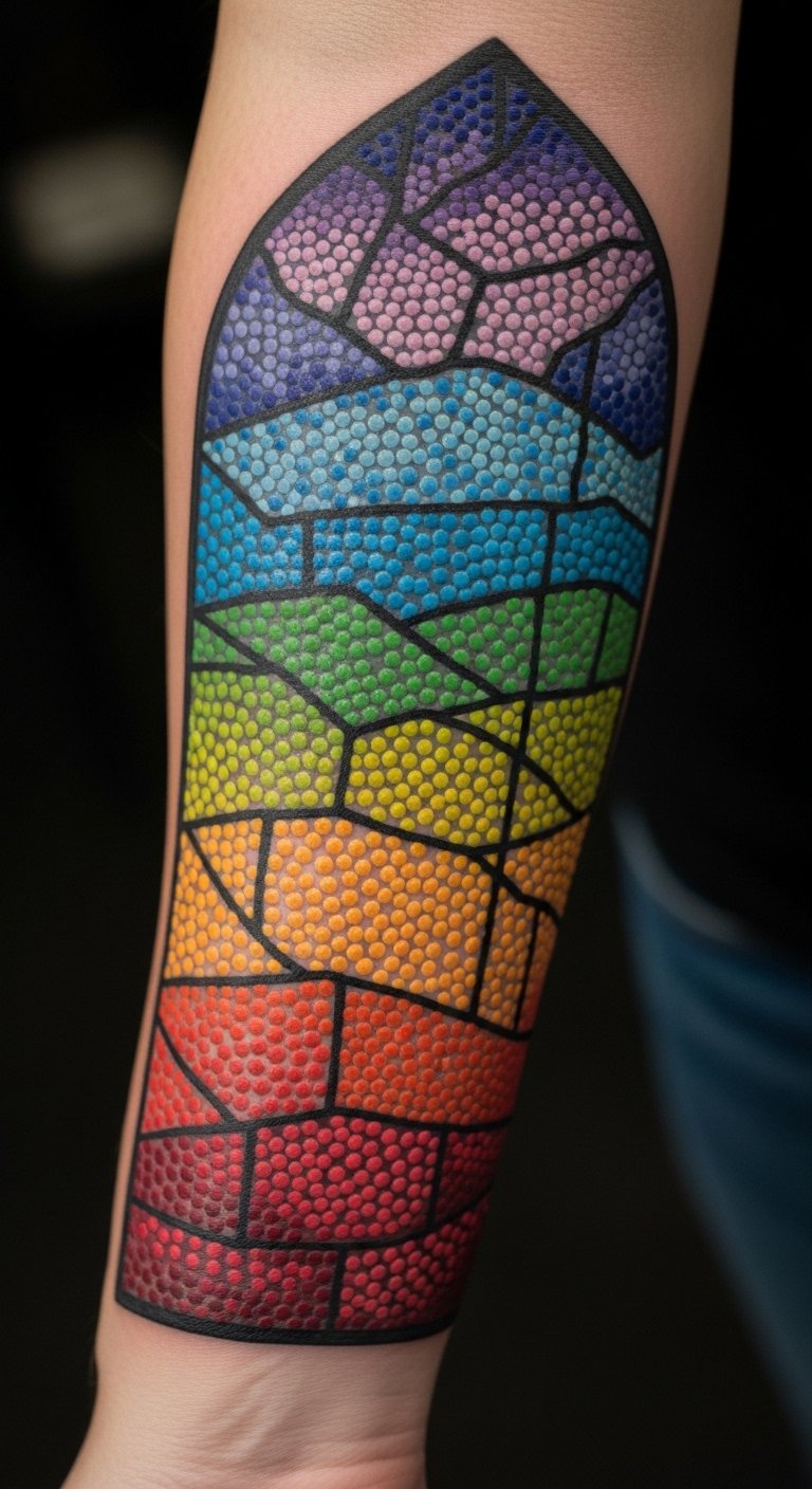Dotwork stained glass tattoos layer dots for texture on your arm. Make dots on paper with a pen. Build up slowly. This design adds depth. Use free tools to dot. Place it for texture feel. Include layered effects. Budget with dot practice. Find ideas in art. This tattoo feels tactile. Start dotting at home.
