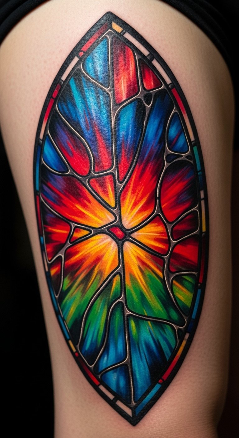 Abstract stained glass tattoos explode colors on your thigh. Splash colors on paper freely. Let it burst. This style energizes. Use phone colors for play. Place it boldly. Include explosion effects. Budget with fun sketches. Gather abstract inspirations. This tattoo sparks joy. Start color plays.