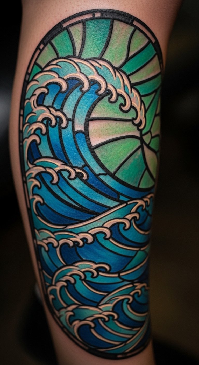 Ocean stained glass tattoos wave on your leg. Sketch waves on paper. Make it fluid. This design flows. Try water effects. Put it on curves. Add sea life. Save with simple waves. Look at oceans. This tattoo brings water. Practice wave drawings.