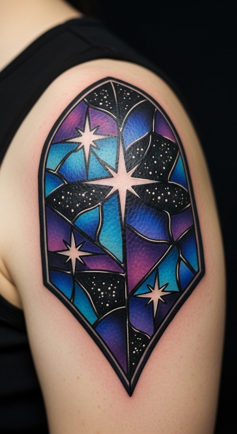 Celestial stained glass tattoos star on your shoulder. Dot stars on paper. Create constellations. This design shines. Use free star maps. Place it high. Include planets. Budget with dots. Find sky ideas. This tattoo lights up. Start star sketches.