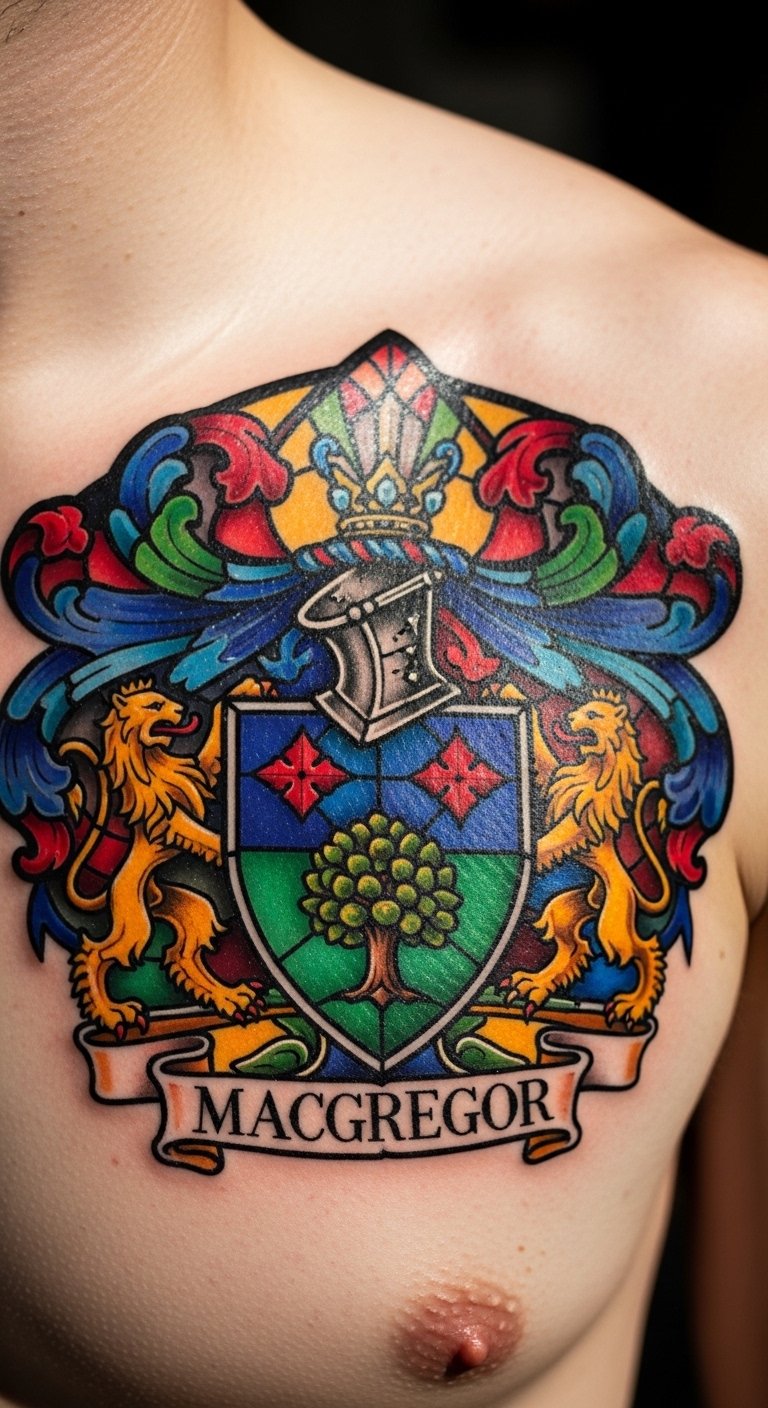 Personalized stained glass tattoos show crests on your chest. Design your crest on paper. Make it family. This design personalizes. Use free creators. Place it proudly. Include family symbols. Budget with plans. Gather heirloom ideas. This tattoo honors roots. Draw crests first.