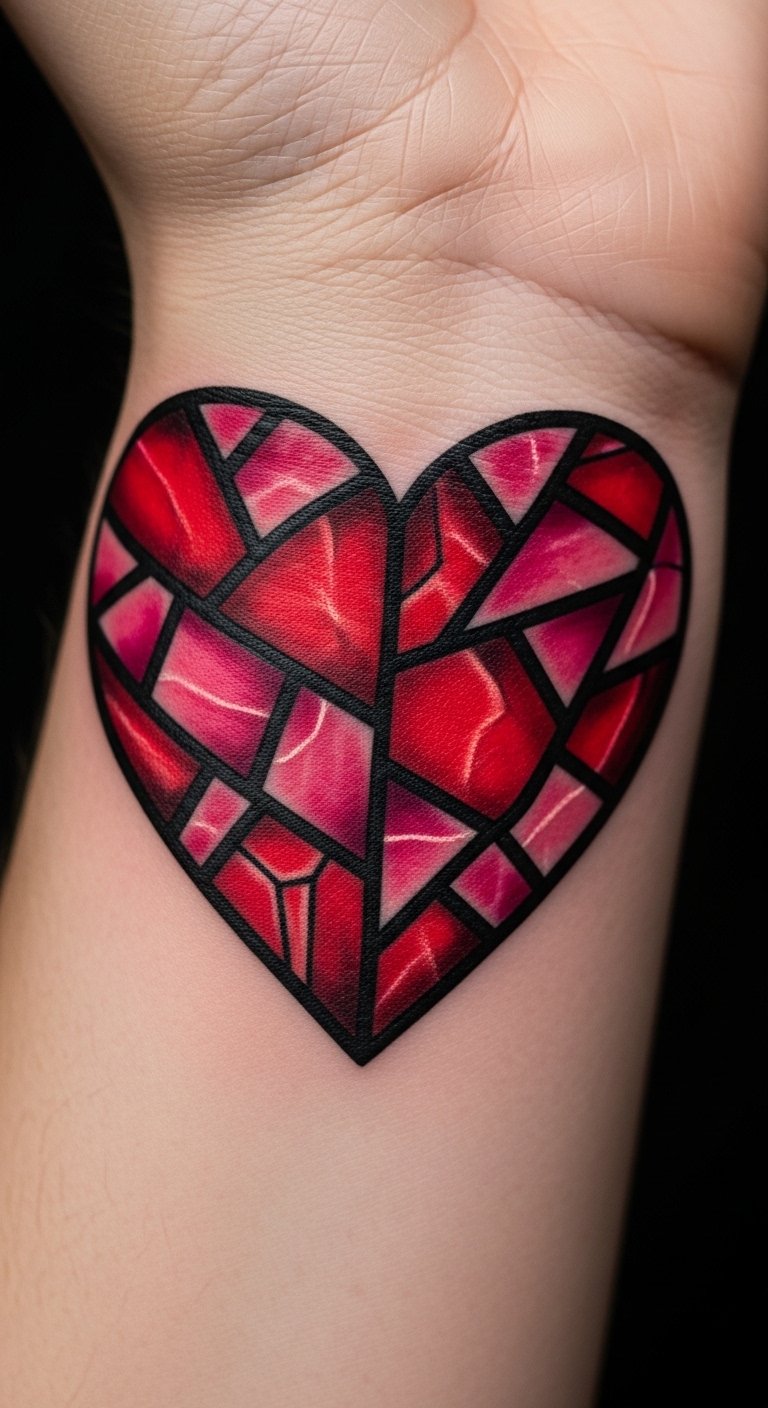 Symbolic stained glass tattoos heart on your wrist. Sketch hearts easily. Show emotion. This design warms. Try phone hearts. Put it near pulse. Add symbolic touches. Save with simple shapes. Find love ideas. This tattoo speaks feelings. Start heart drawings.