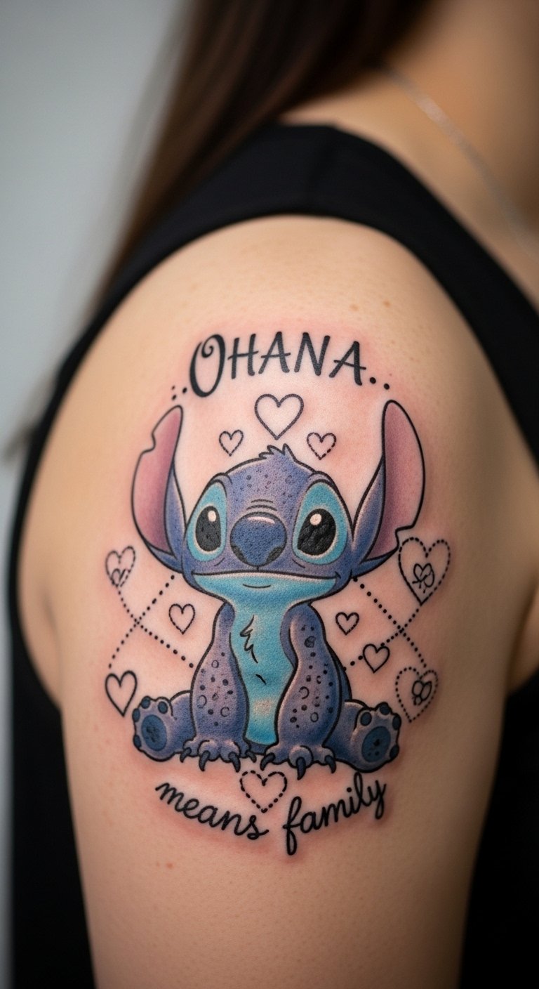 An Ohana-themed Stitch tattoo highlights family ties. It pairs the character with symbols like hearts. Jot down your family story on paper first. Use household items to mock up the design. This cuts expenses early. Place it on your back for meaning. Find artists who offer payment plans. Include a date for memories. One session covers it all. Test with henna kits from stores. Your tattoo keeps its charm with easy upkeep. It’s ideal for heartfelt expressions.