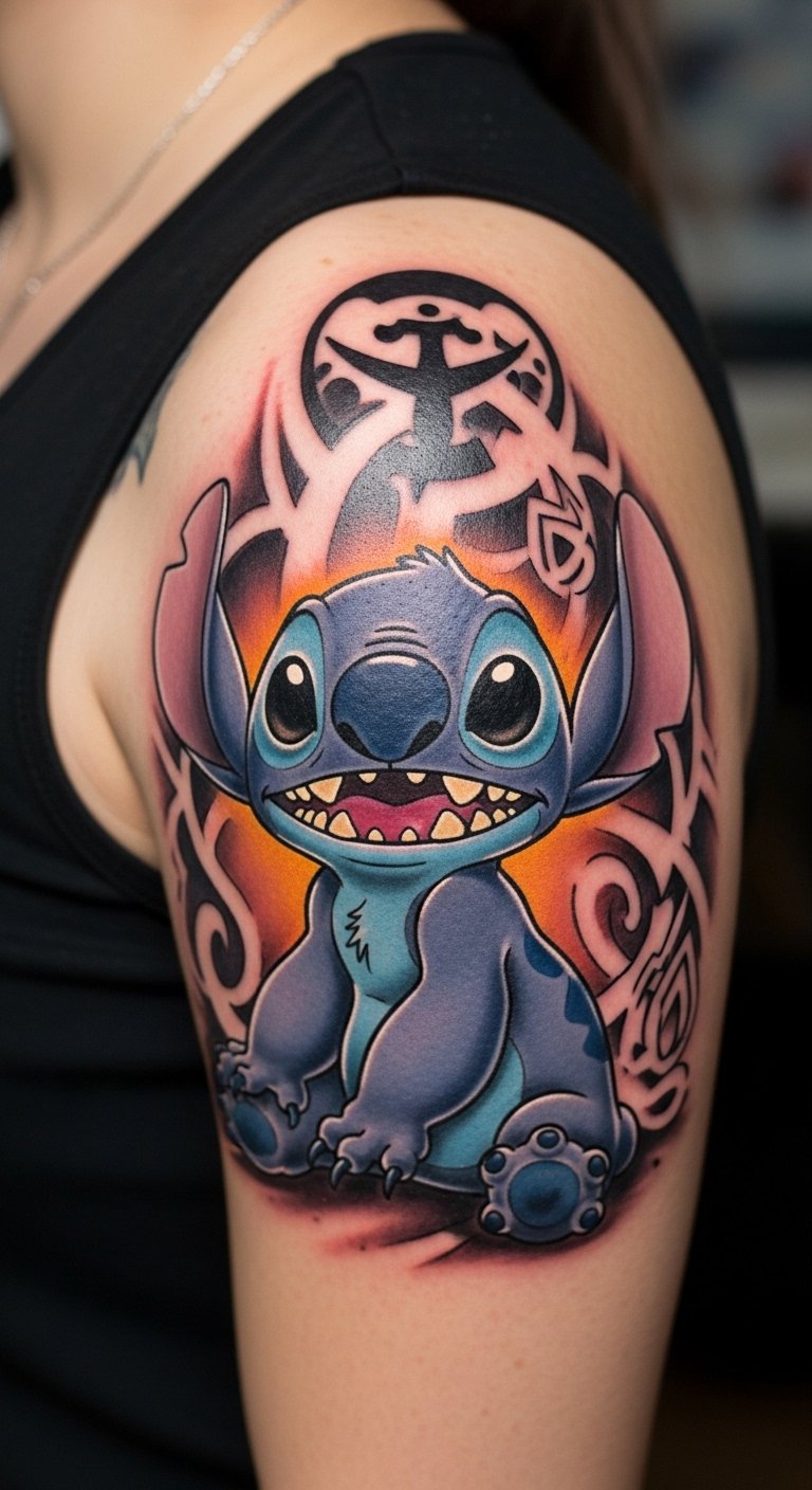 Anime style Stitch tattoos amp up energy. Use bold lines and eyes. Sketch anime versions at home. Free tutorials teach styles. This preps on a budget. Opt for arm placement. Find specialized artists. Add dynamic poses. A session brings it alive. Your design pops with care.