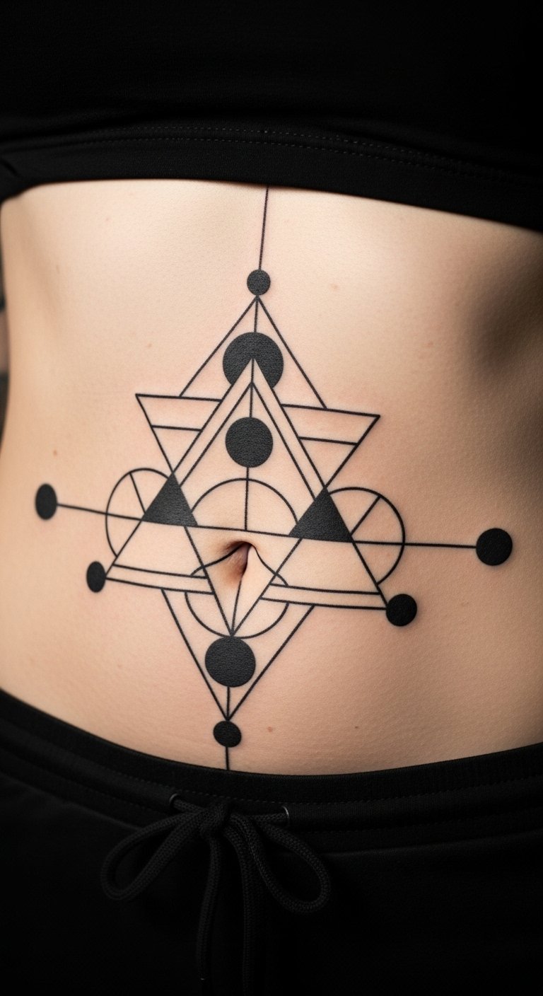 Geometric tattoos bring a clean, modern vibe to your stomach. Shapes like triangles or hexagons create balance and edge. They suit any body type. Draw rough designs on your skin with washable markers for a DIY test. Look for artists who charge by the hour to stay under budget. Aim for small sizes to keep costs low. Mix in abstract elements for a unique twist. Free online templates help you plan at home. This style hides well under clothes if needed. Choose black ink for a timeless look. Visit community events for cheap tattoo fairs. It makes getting inked feel simple and fun.