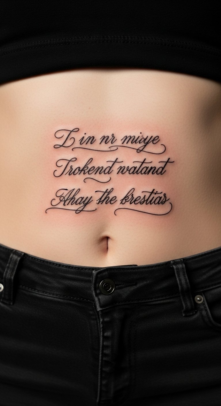 A quote tattoo turns words into art on your stomach. Pick phrases like “be brave” in stylish fonts. It adds motivation every day. Write options in a notebook to see what fits. Search for budget artists on social media apps. Prices start at $50 for basic scripts. Use free font generators for DIY planning. Place it low on the stomach for easy cover. Black ink keeps it straightforward. Share ideas with a friend for feedback. This design encourages positive thoughts without extra cost. Keep it short to simplify the process.