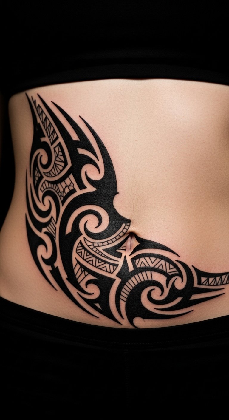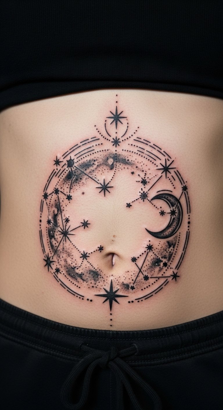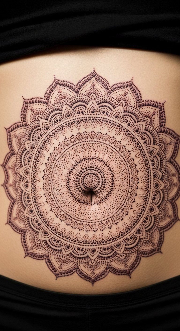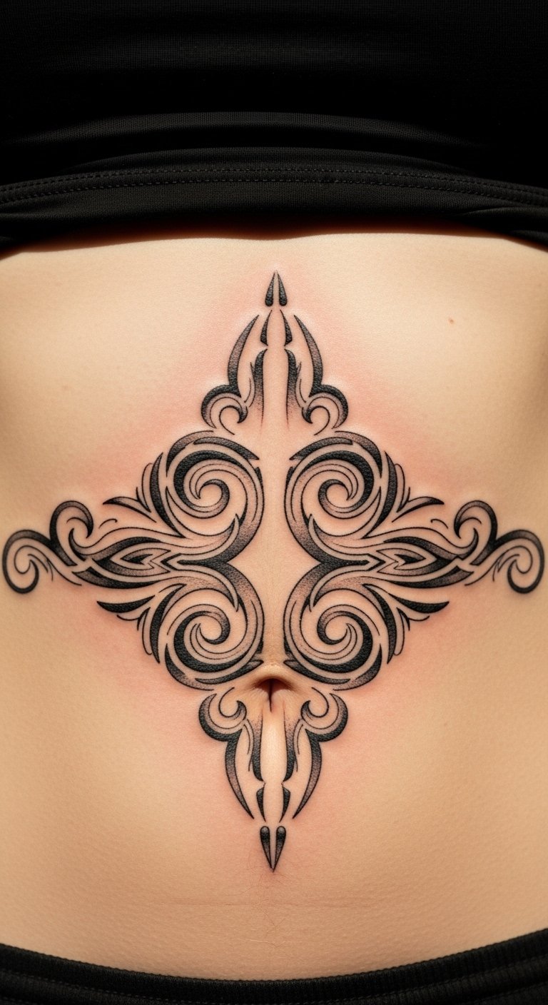 Abstract symmetry creates a balanced look on your stomach. Swirls and lines offer a modern feel. It enhances your shape. Practice symmetry with string art at home for free. Seek artists with package deals under $120. Go for medium sizes to balance cost. Online videos guide your DIY planning. Black ink ensures longevity. Visit art galleries for ideas. This design feels artistic and straightforward.