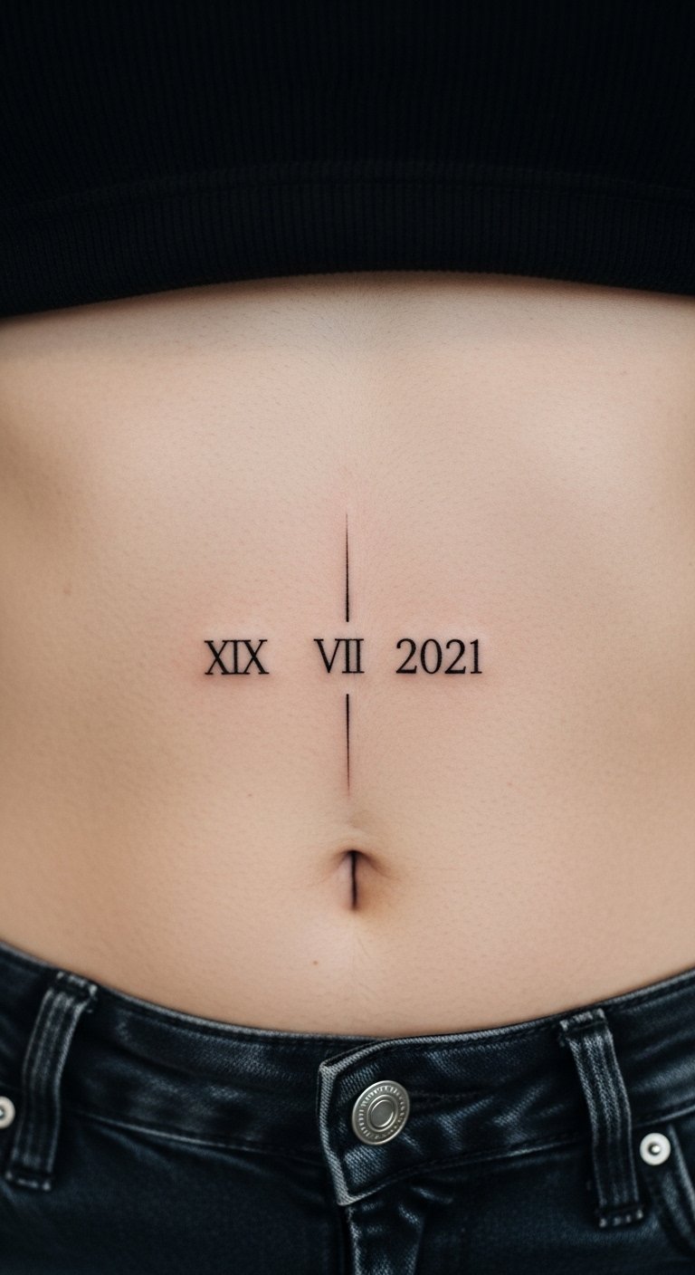 Roman numerals mark special dates on your stomach. Numbers like “MMXXIII” keep it simple. It honors memories. Write dates on a calendar as a free plan. Artists charge $60 for basics. Keep it tiny to cut costs. Use number stencils for home ideas. Black ink works best. Share with family for input. This tattoo feels meaningful and easy.