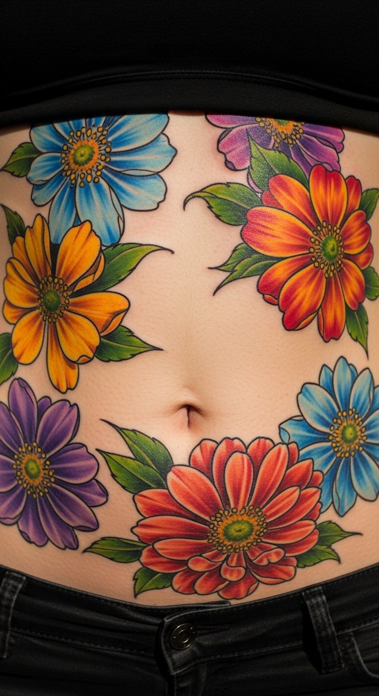 A floral tattoo adds a touch of beauty to your stomach. Think simple roses or lilies that follow your body’s shape. This design works well for first-timers. Start by sketching ideas on paper with a basic pen. Find an affordable artist online for under $100. Keep it small to save money. Use free apps like drawing tools to experiment at home. Bold colors pop, but black ink lasts longer. Get inspired by nature walks. This choice lets you express femininity without much fuss. Talk to friends about their experiences. You can adjust the size to fit your budget. Remember to check local studios for deals.