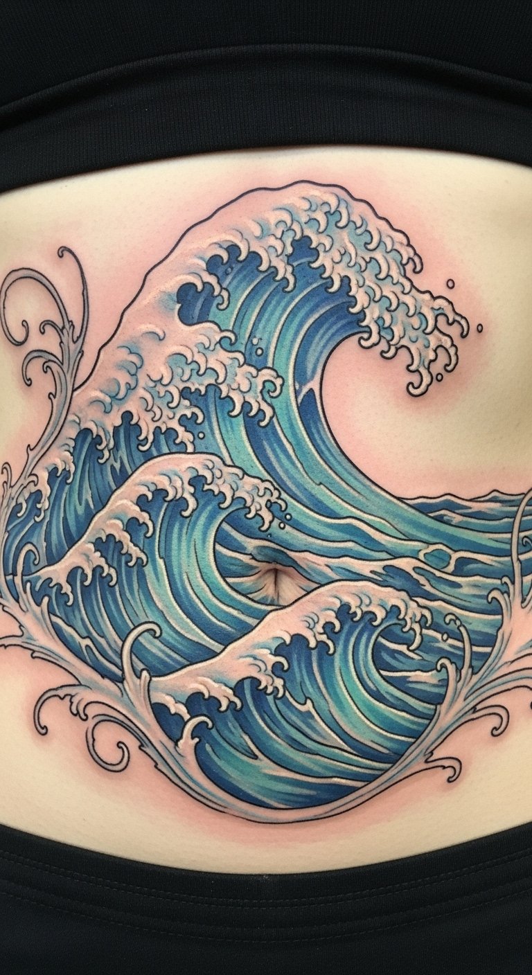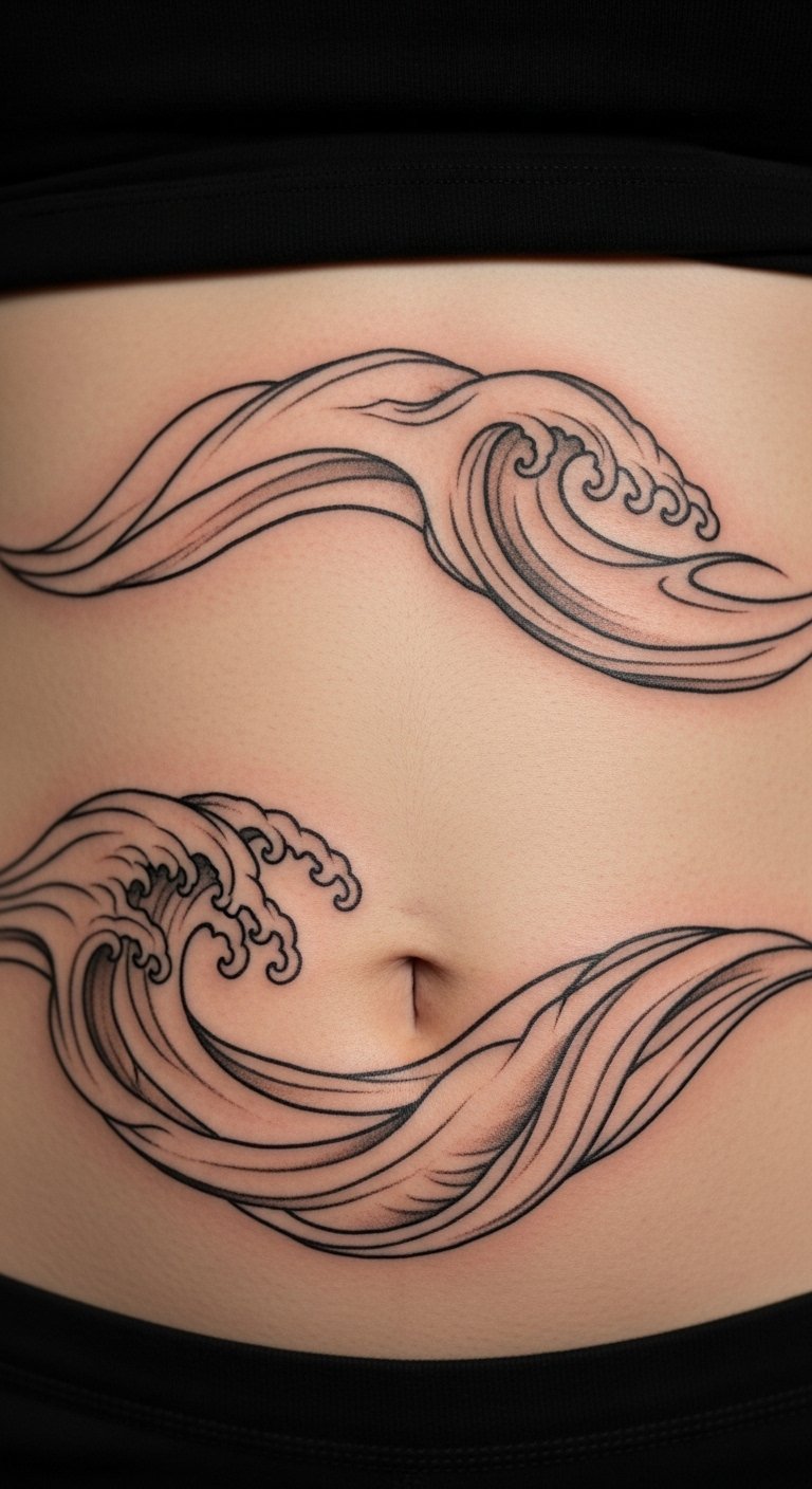 Wave patterns flow across your stomach. Curves suggest motion. It feels fluid. Draw waves with a ruler at home. Budget artists charge $80. Keep patterns simple. Online tools help design. This creates a serene look.