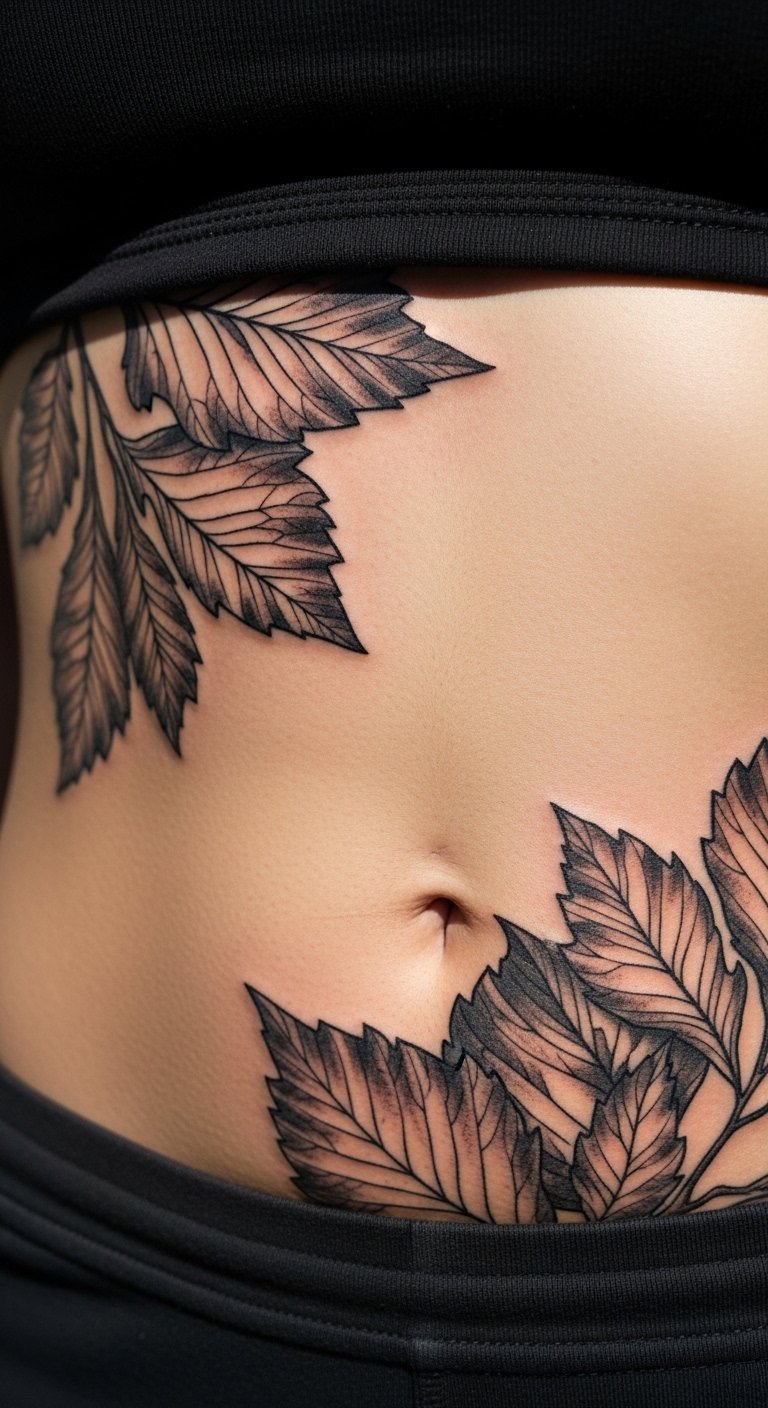 Leaves from nature grace your stomach. Outlines mimic foliage. It connects to the outdoors. Sketch leaves in your yard. Artists price at $70. Go small for deals. Free nature apps inspire.