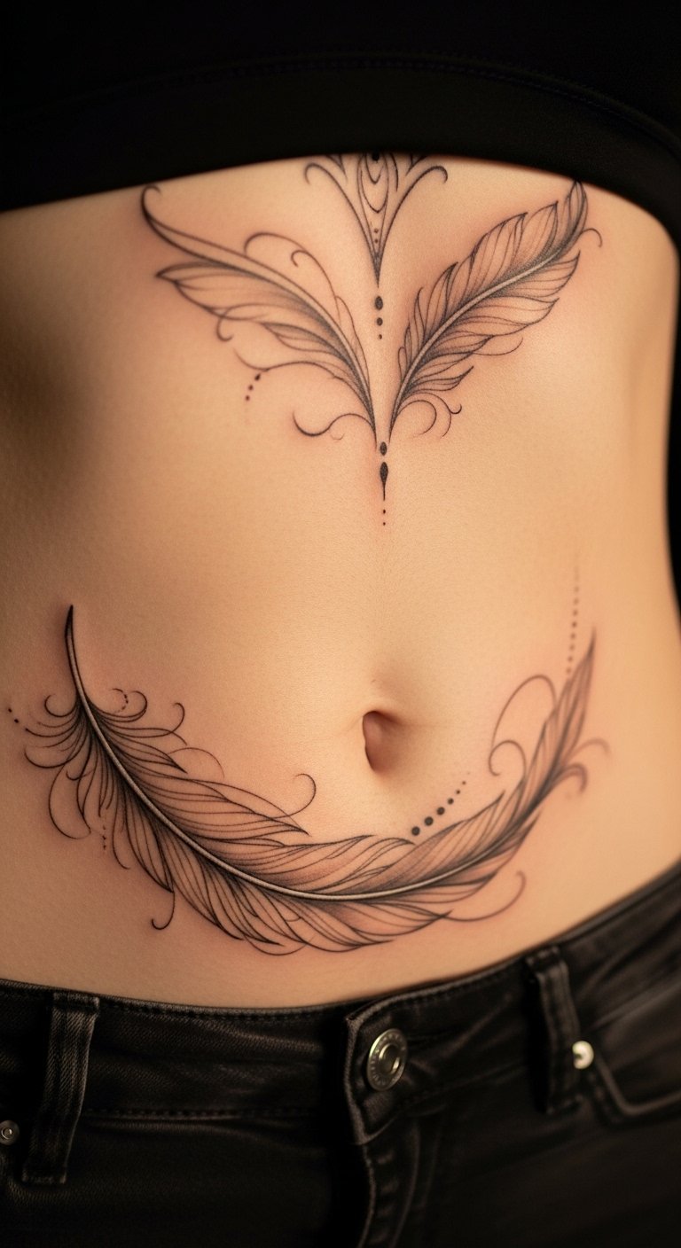 Feathers float on your stomach. Light designs suggest freedom. It feels light. Practice with feather drawings. Find deals at $80. Use simple strokes.