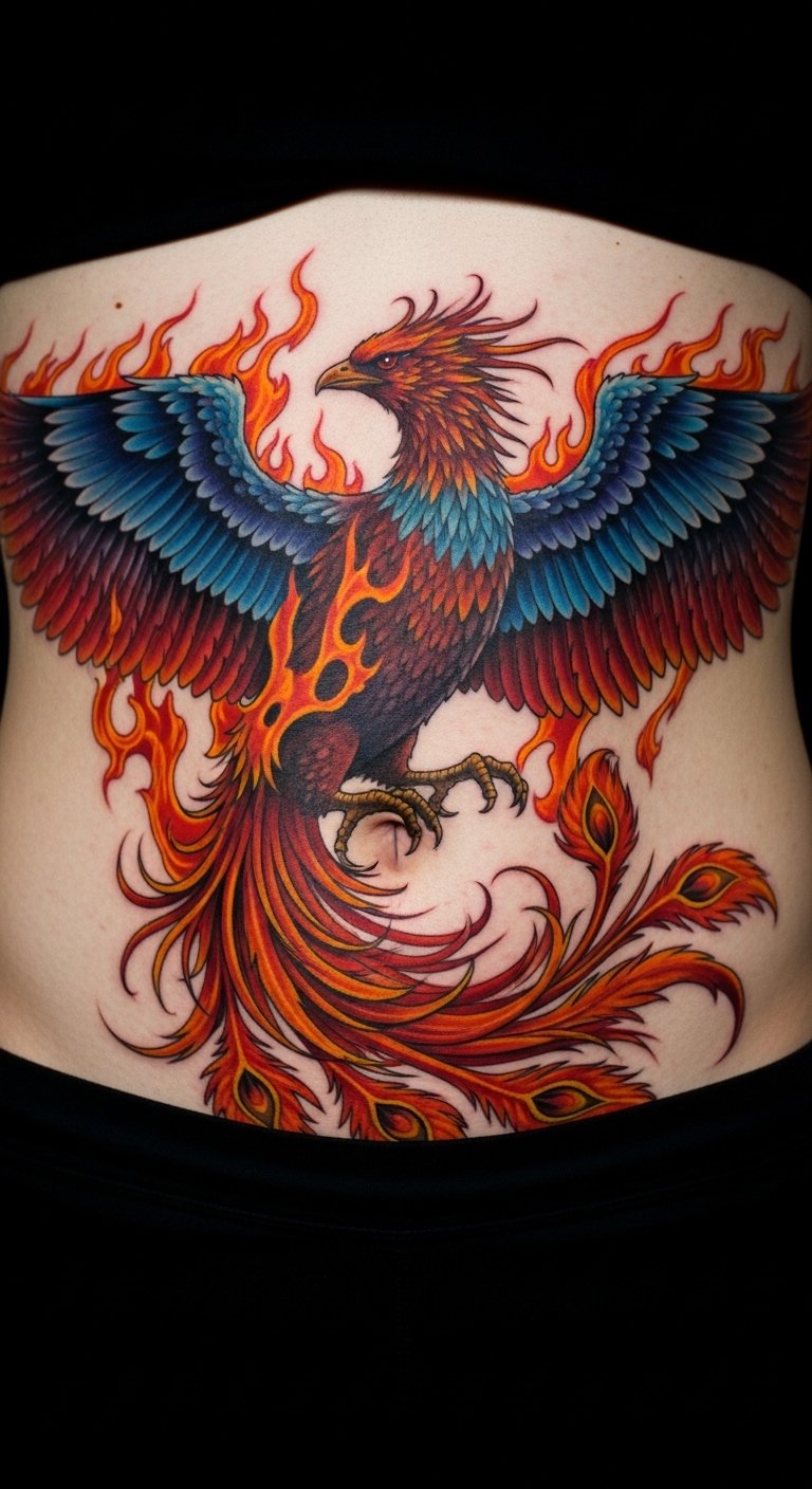 Phoenix symbols rise on your stomach. Flames show rebirth. It empowers change. Sketch phoenixes freehand. Artists charge $110. Scale for budget.
