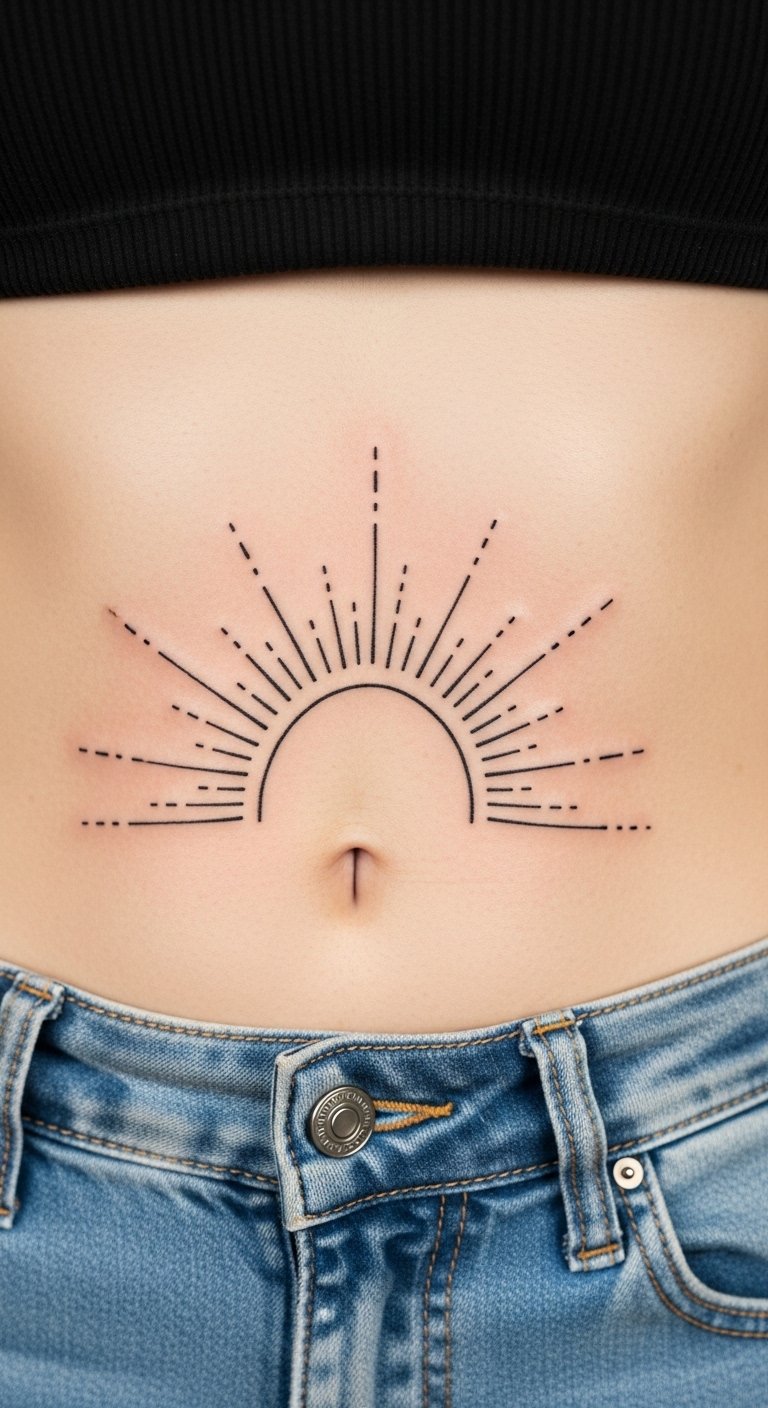 Sunburst rays brighten your stomach. Rays spread energy. It lifts spirits. Draw rays with a pencil. Artists charge $70. Keep it radiant.