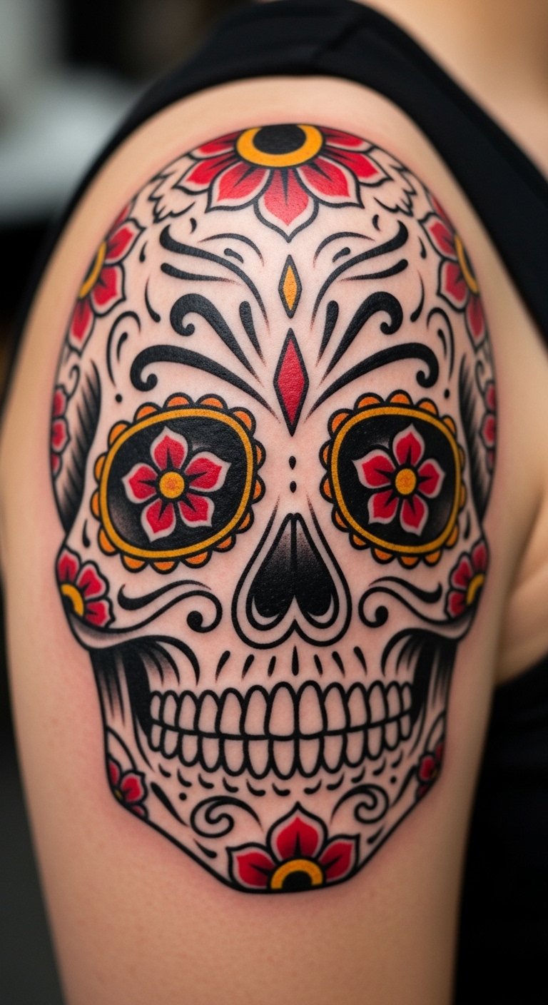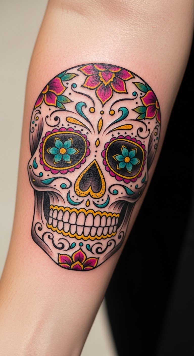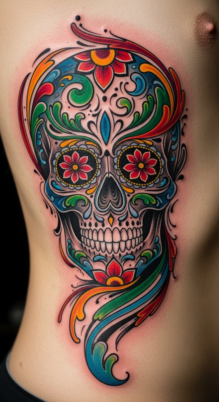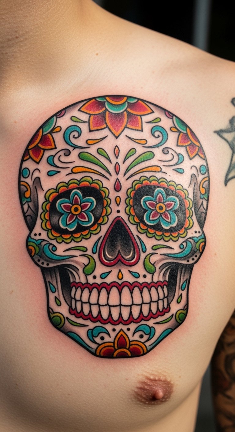 Bring energy to your ink with vivid shades. Reds and yellows make the skull stand out. Pick spots like your back for big impact. Try water-based markers to plan at home. Mix in affordable DIY stencils from paper. This design celebrates life. Add hearts or stars for fun. Keep it fresh with simple after-session care. No need for extras—just your creativity. It fits any budget and tells your tale.