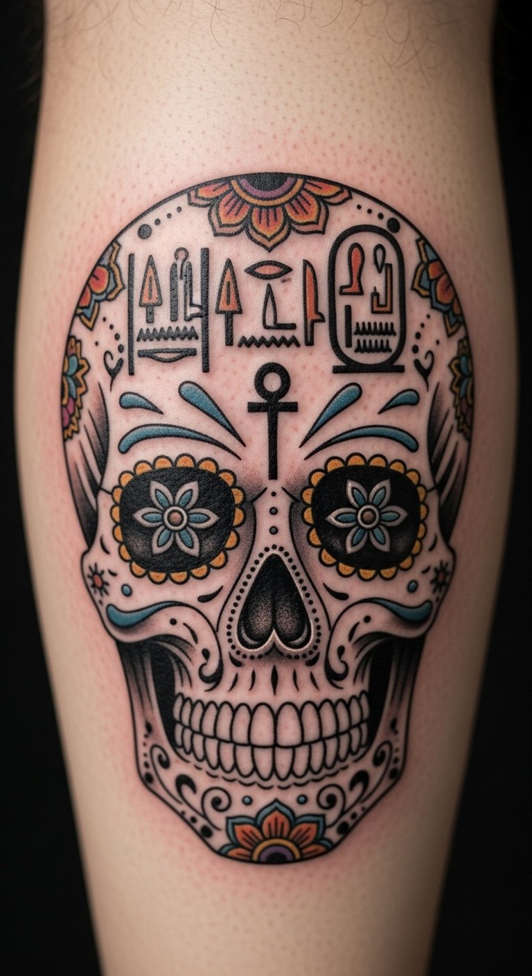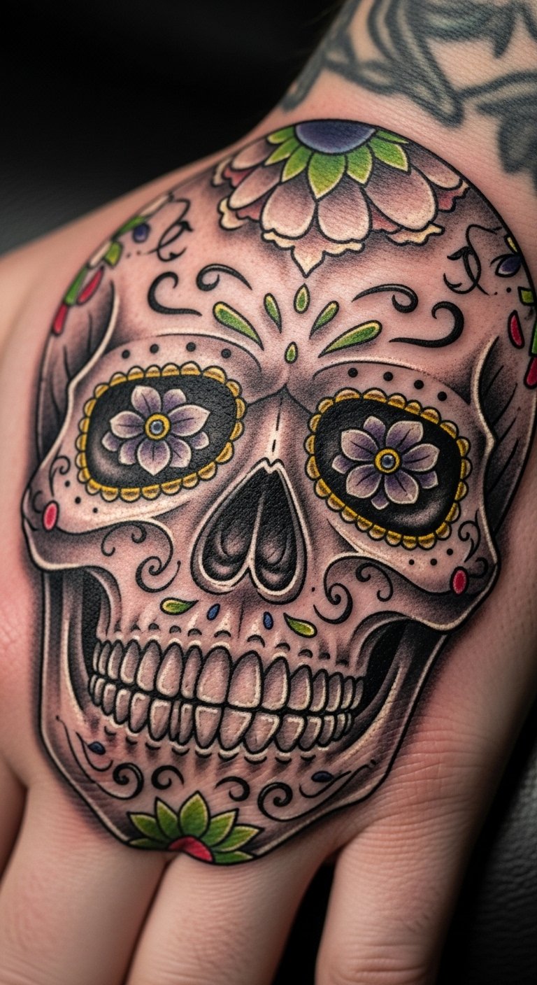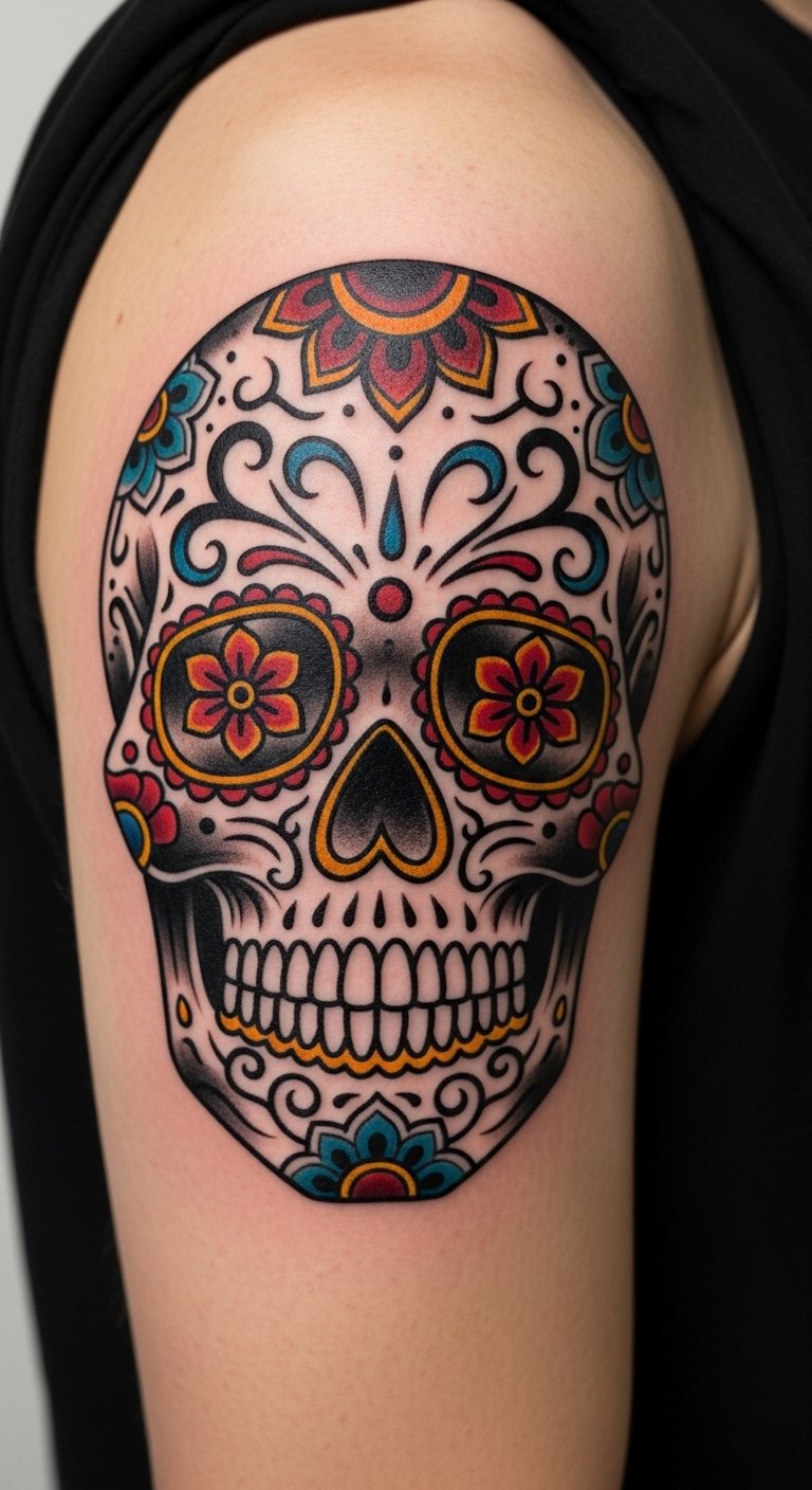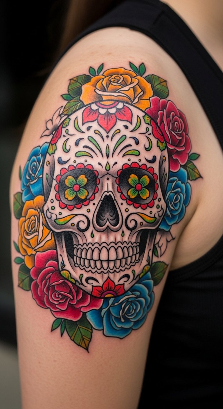 Bring energy to your ink with vivid shades. Reds and yellows make the skull stand out. Pick spots like your back for big impact. Try water-based markers to plan at home. Mix in affordable DIY stencils from paper. This design celebrates life. Add hearts or stars for fun. Keep it fresh with simple after-session care. No need for extras—just your creativity. It fits any budget and tells your tale.